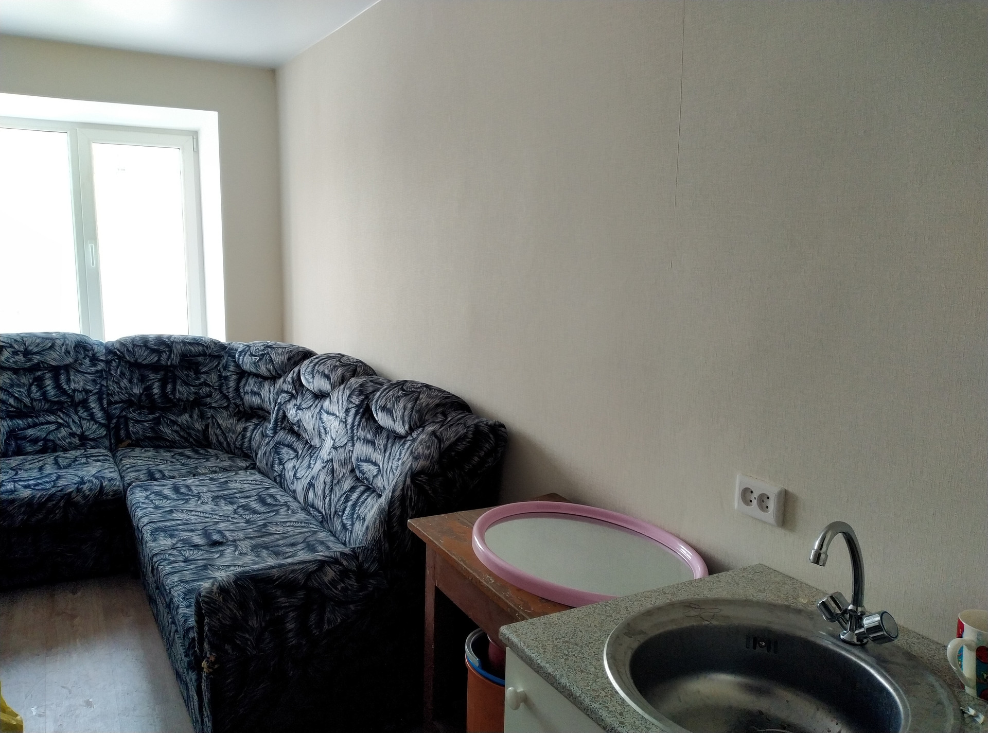 В комнате имеется большой диван, стол, и раковина с водой.