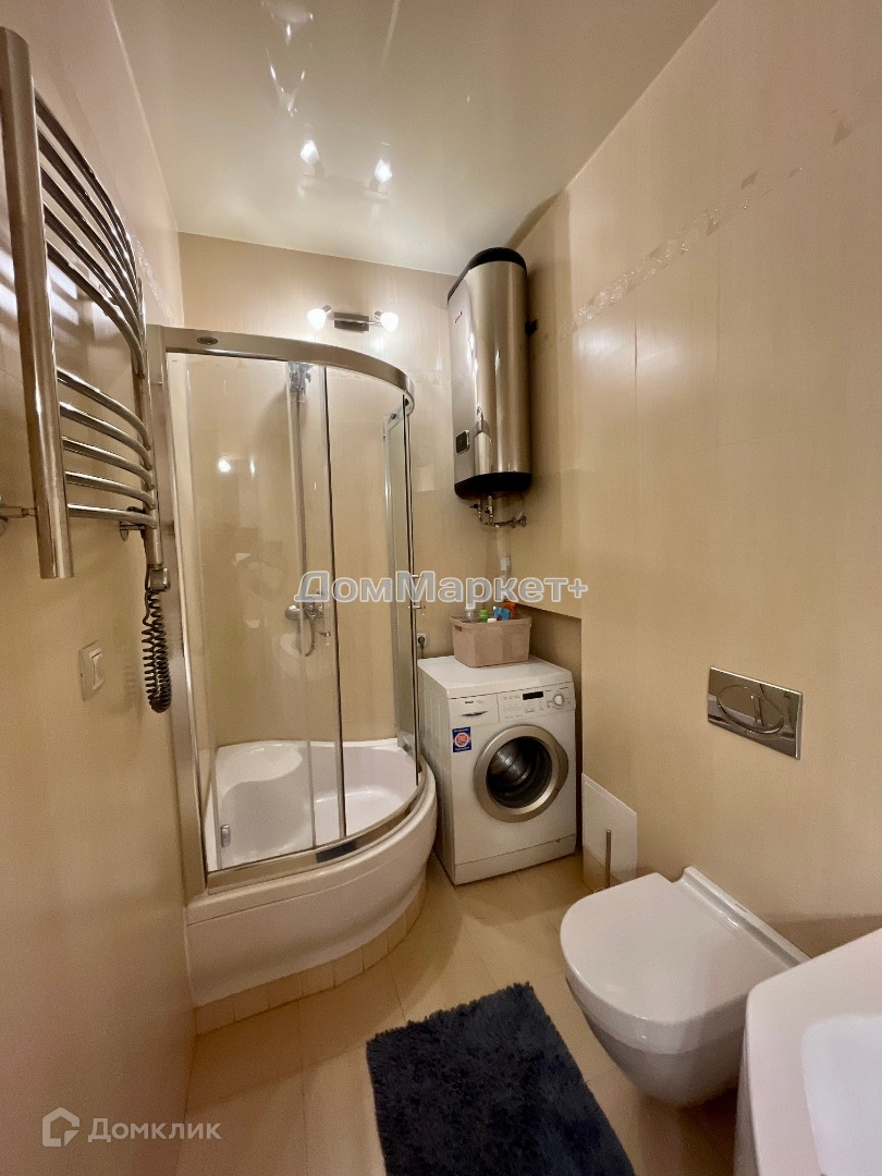 Санузел совмещенный: туалет, большая ванная комната и душевая кабина.