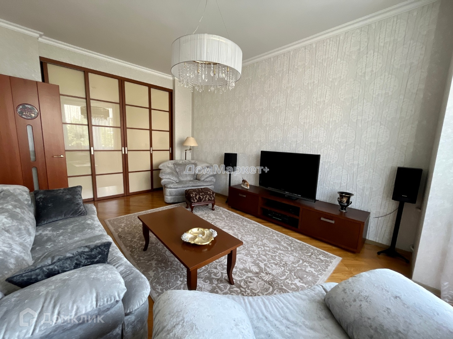 В зале обустроенная зона отдыха с телевизором и огромный шкаф-купе.