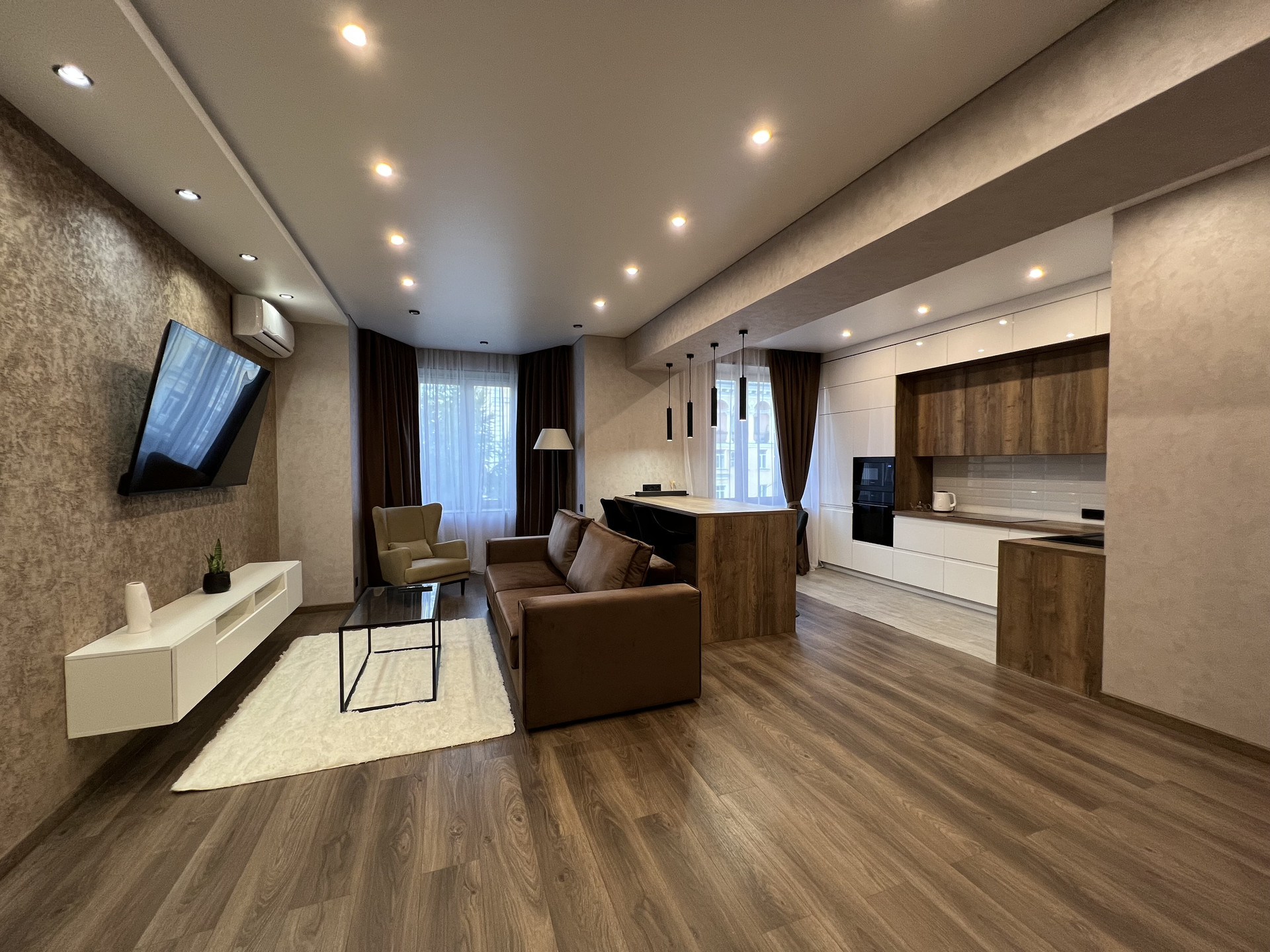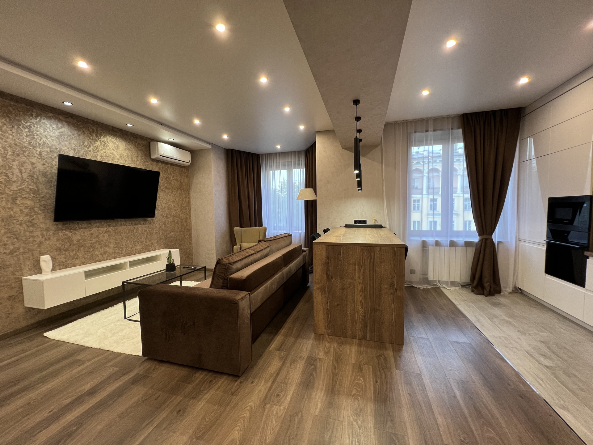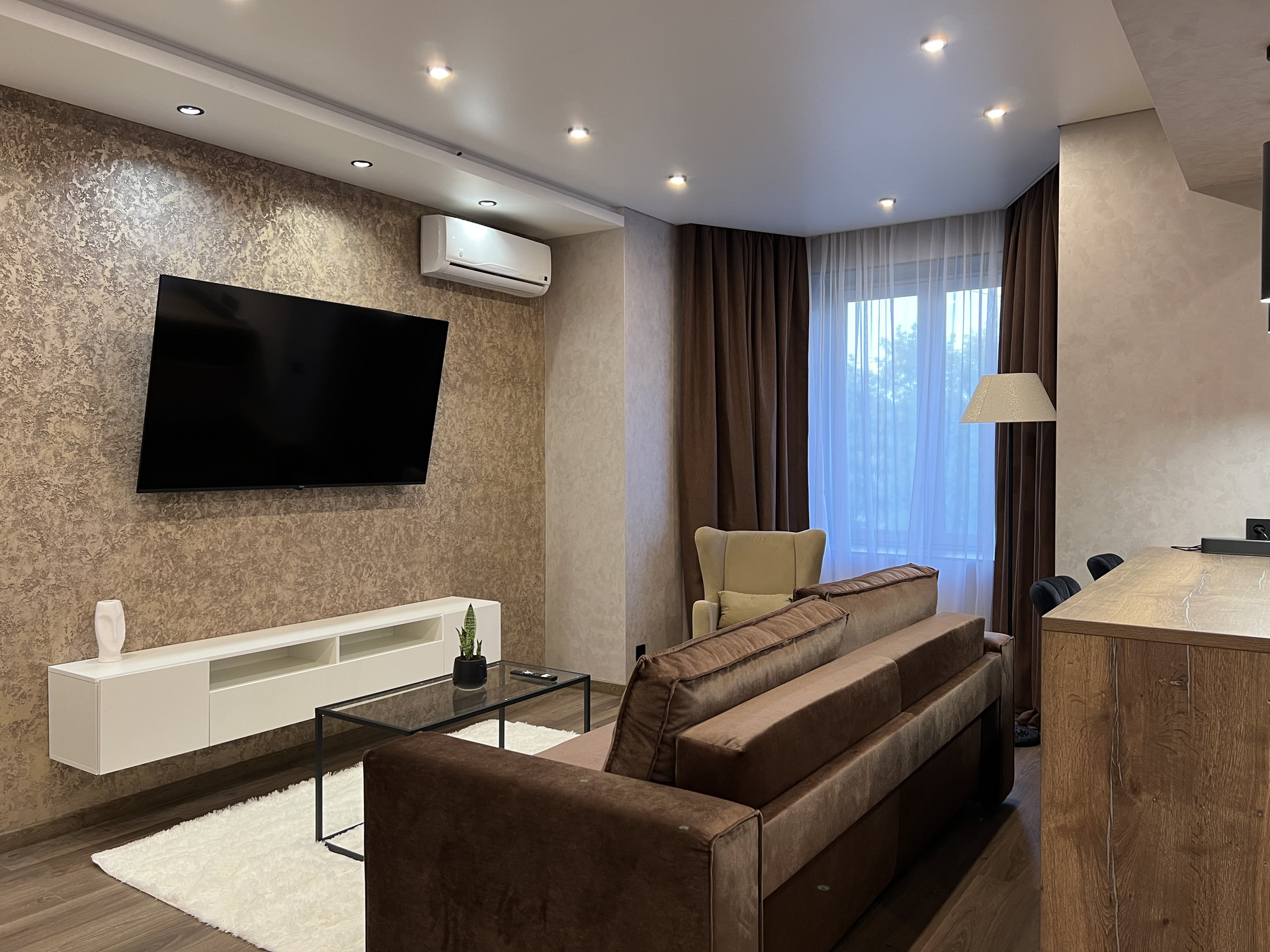 В гостиной большой телевизор 65”, кондиционер, раскладной диван, журнальный столик и кресло, расположенное в эркере.