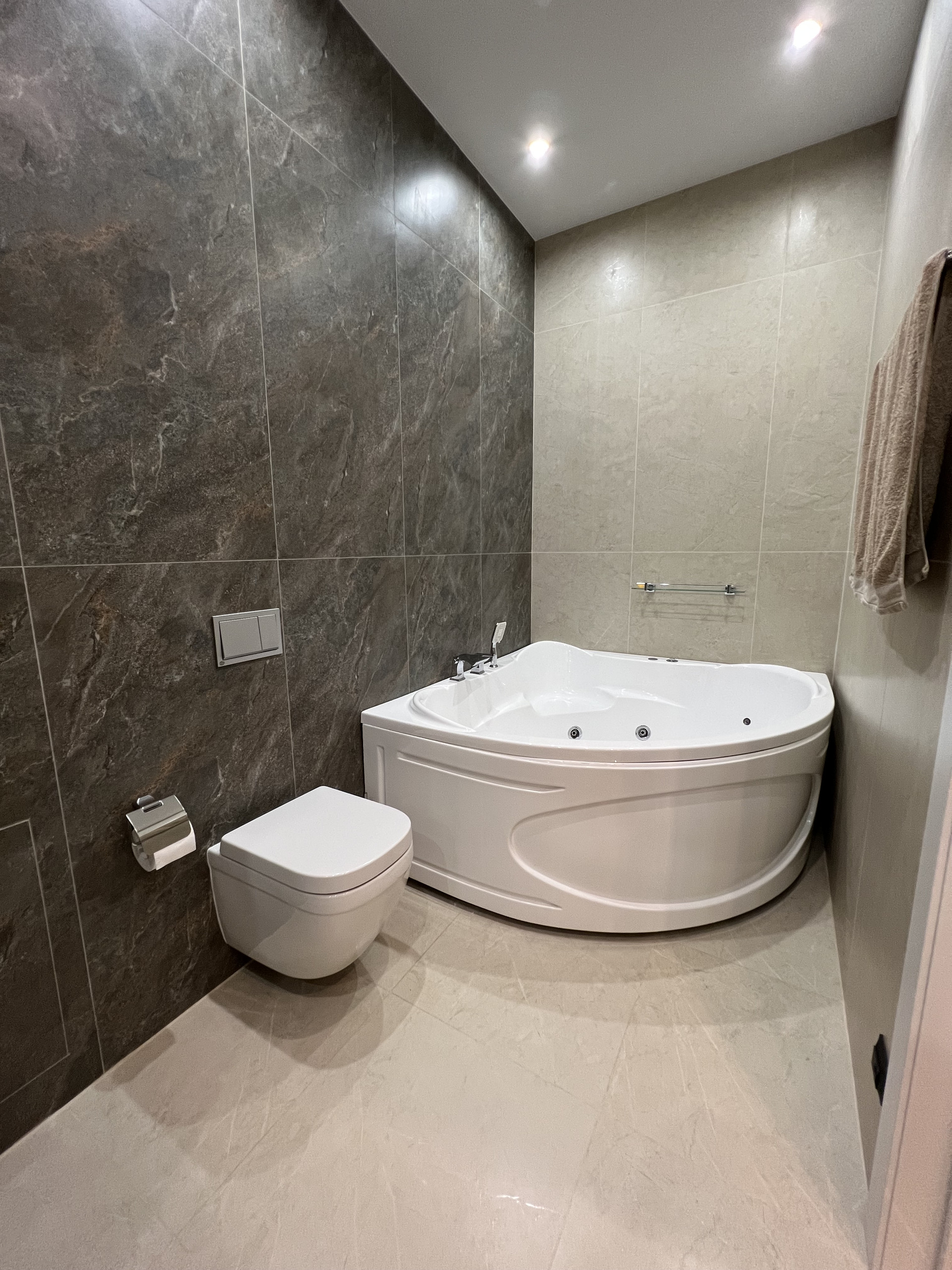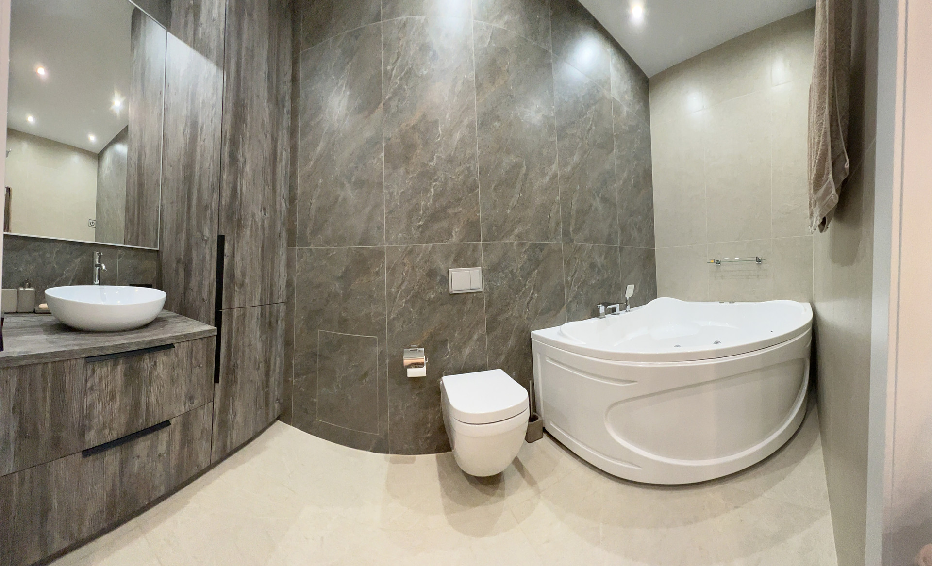 Санузел совмещенный, есть встроенная стиральная машина и бойлер, установлена большая ванна с гидромассажем, на воду установлены фильтры. Пол с подогревом.