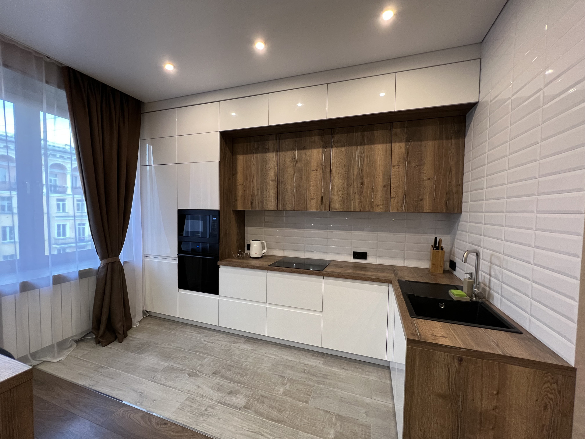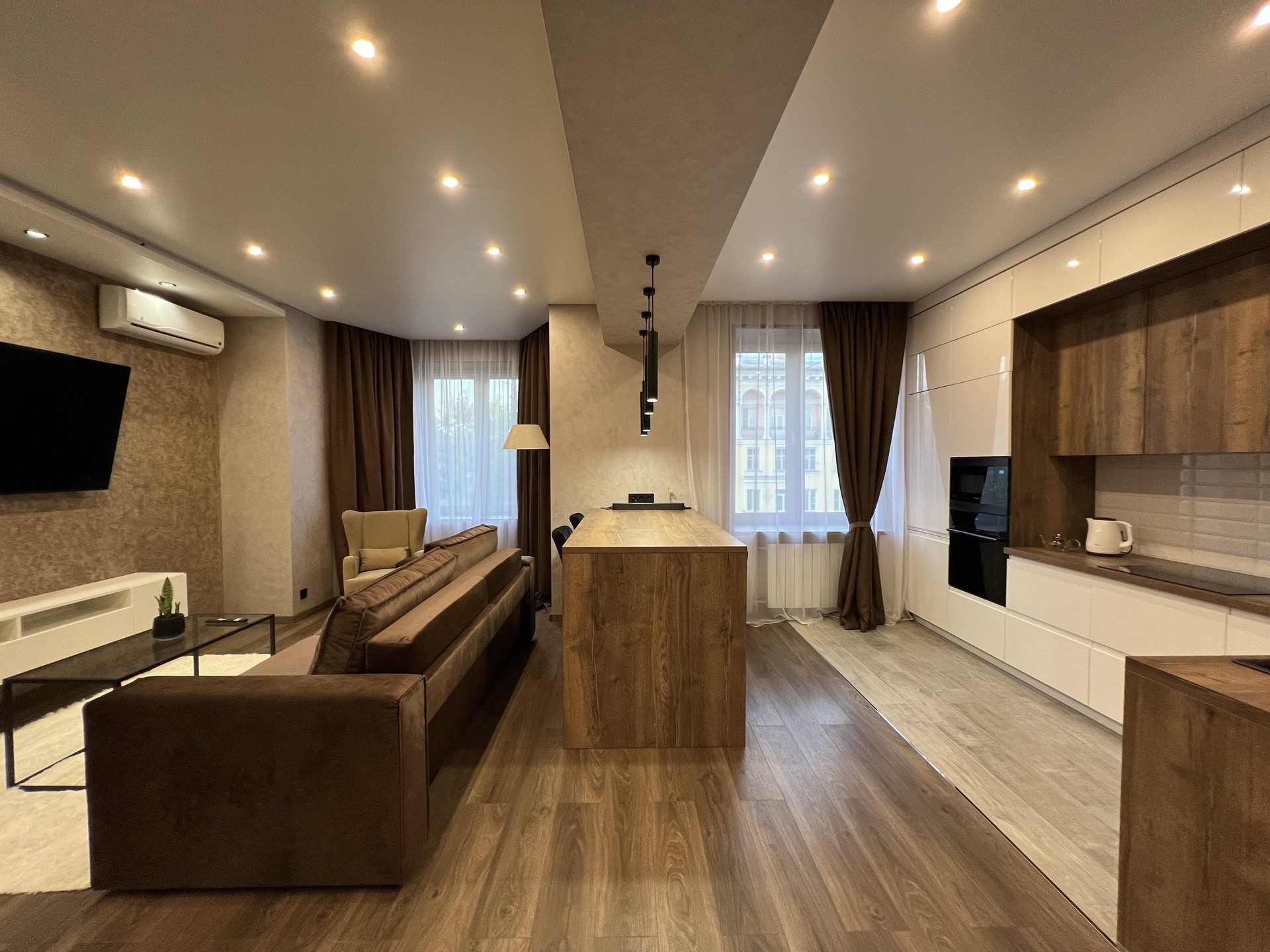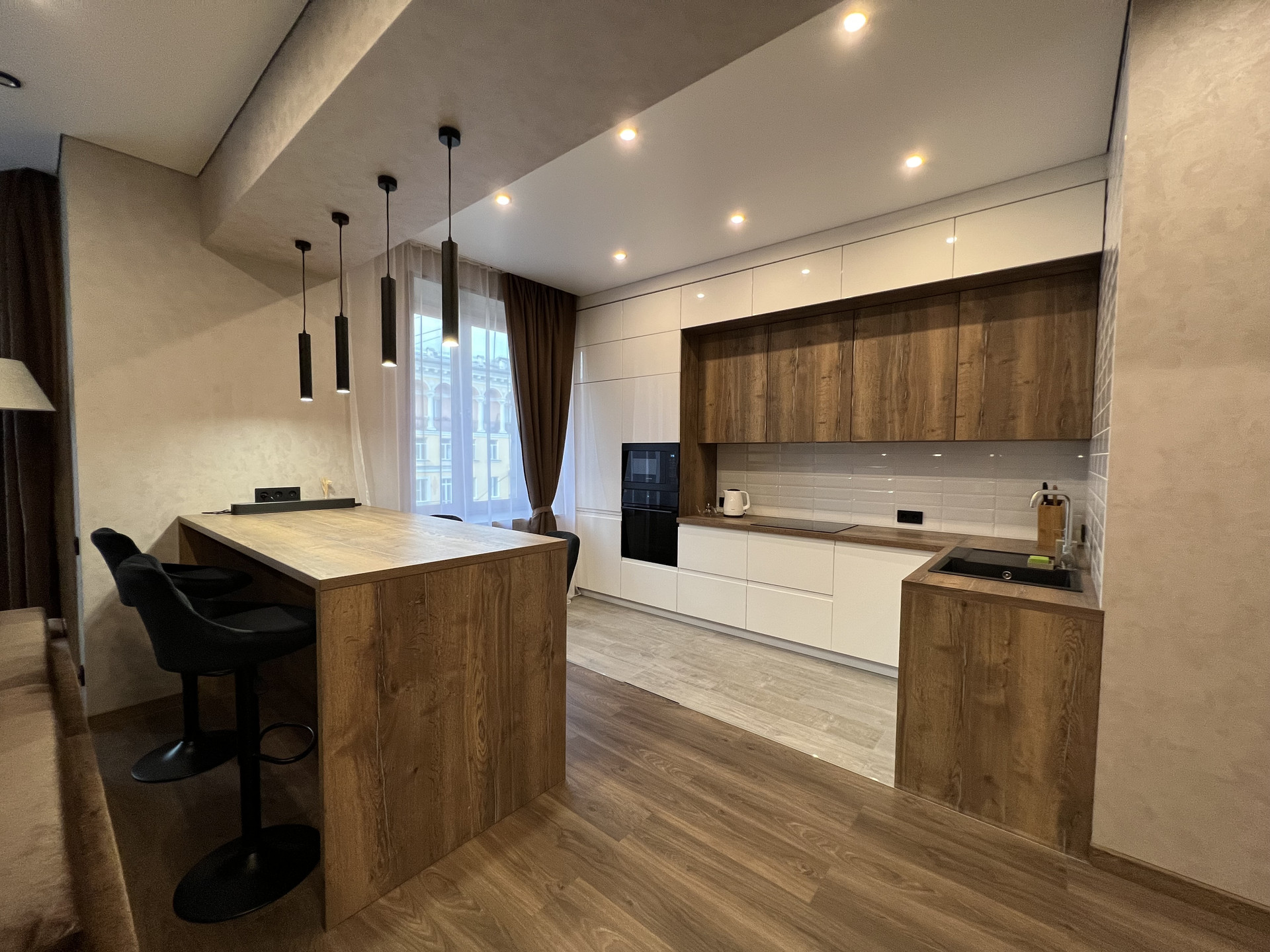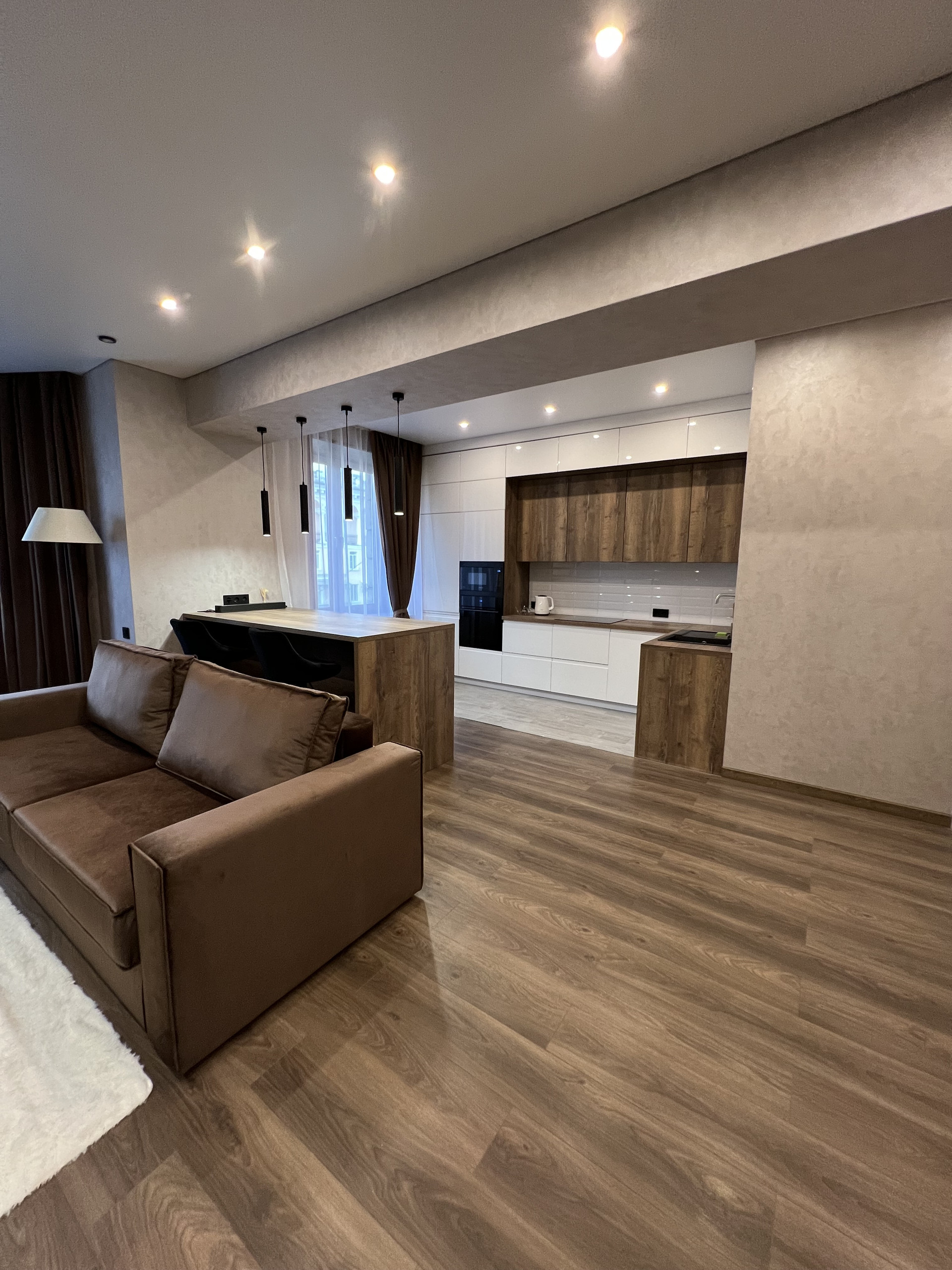 Кухня просторная и совмещена с гостиной, зоны разделены большим барным столом. Кухня оснащена всей необходимой техникой: холодильник, варочная панель с 4 конфорками, духовой шкаф, посудомоечная машина, СВЧ печь, вытяжка (вся техника встроенная), электрический чайник, а также небольшой набор посуды включая сковороды и кастрюли. Пол на кухне с подогревом.