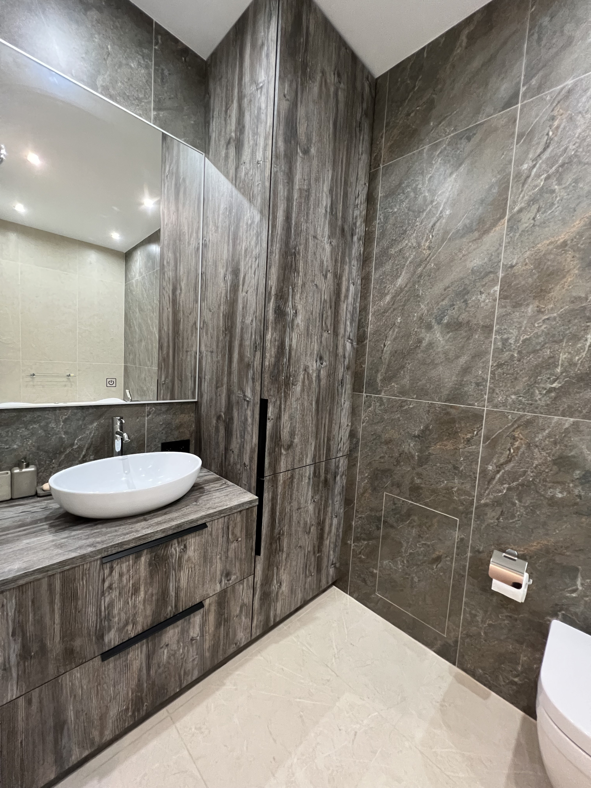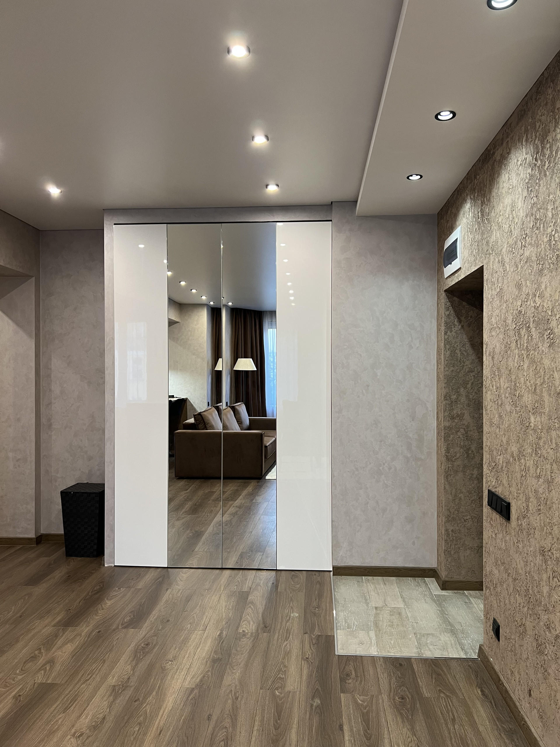 В прихожей большой функциональный шкаф для верхней одежды, обуви и бытовых вещей, пол с подогревом.