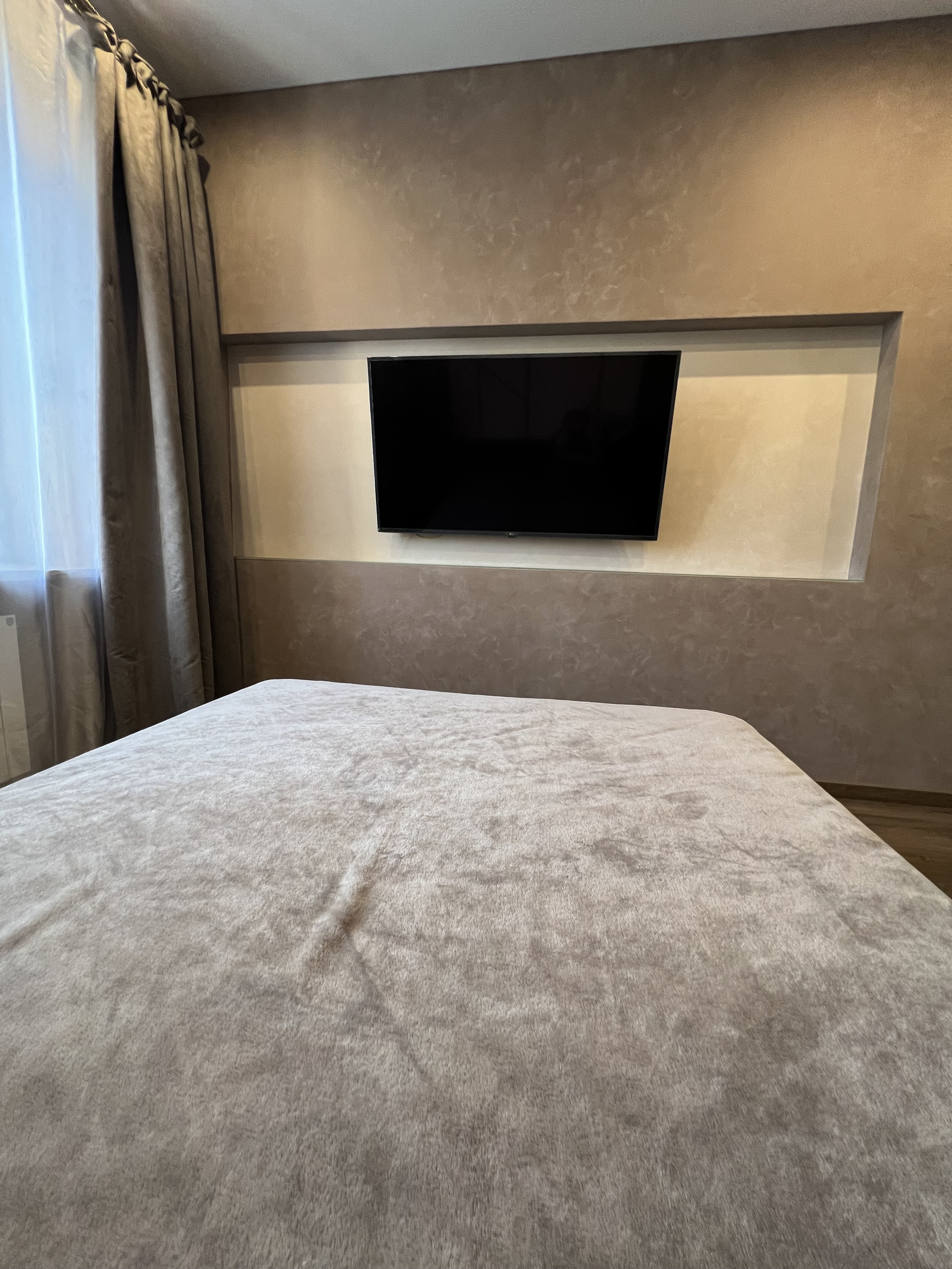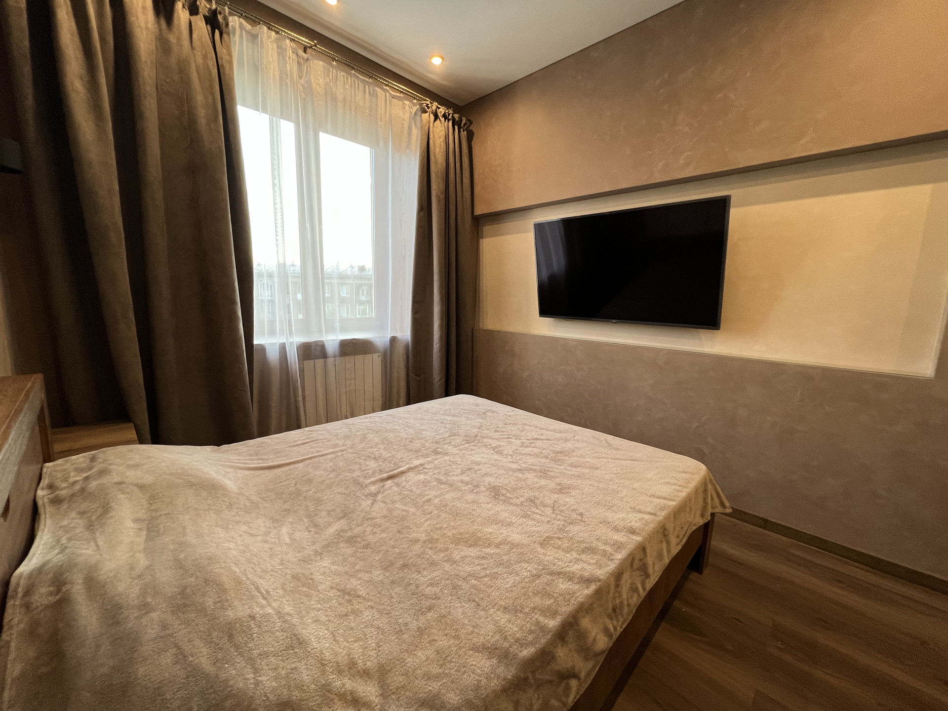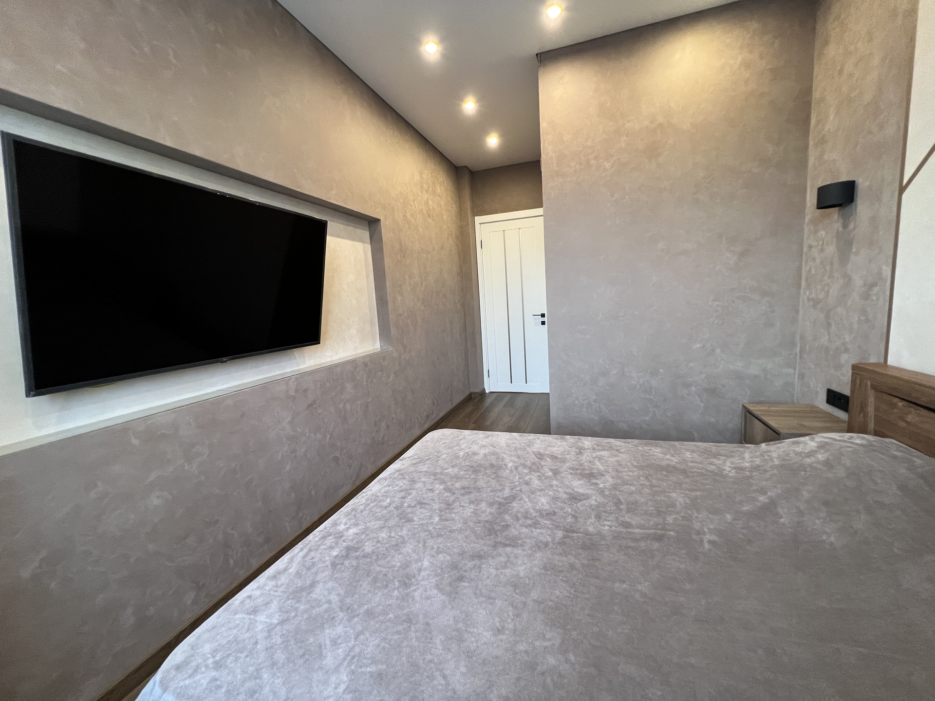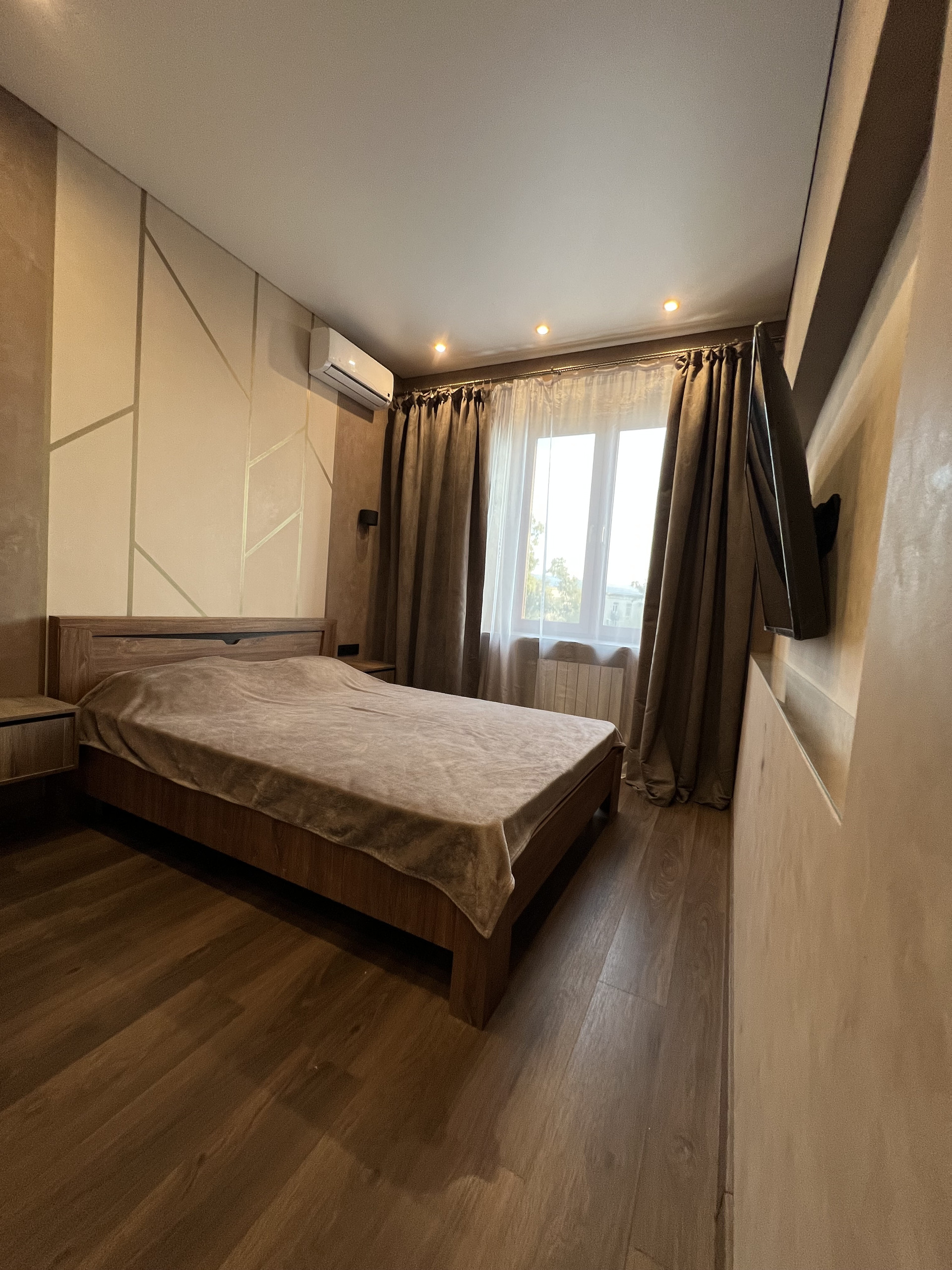 В спальне просторная гардеробная, двуспальная кровать с двумя тумбами, кондиционер и телевизор 55”.