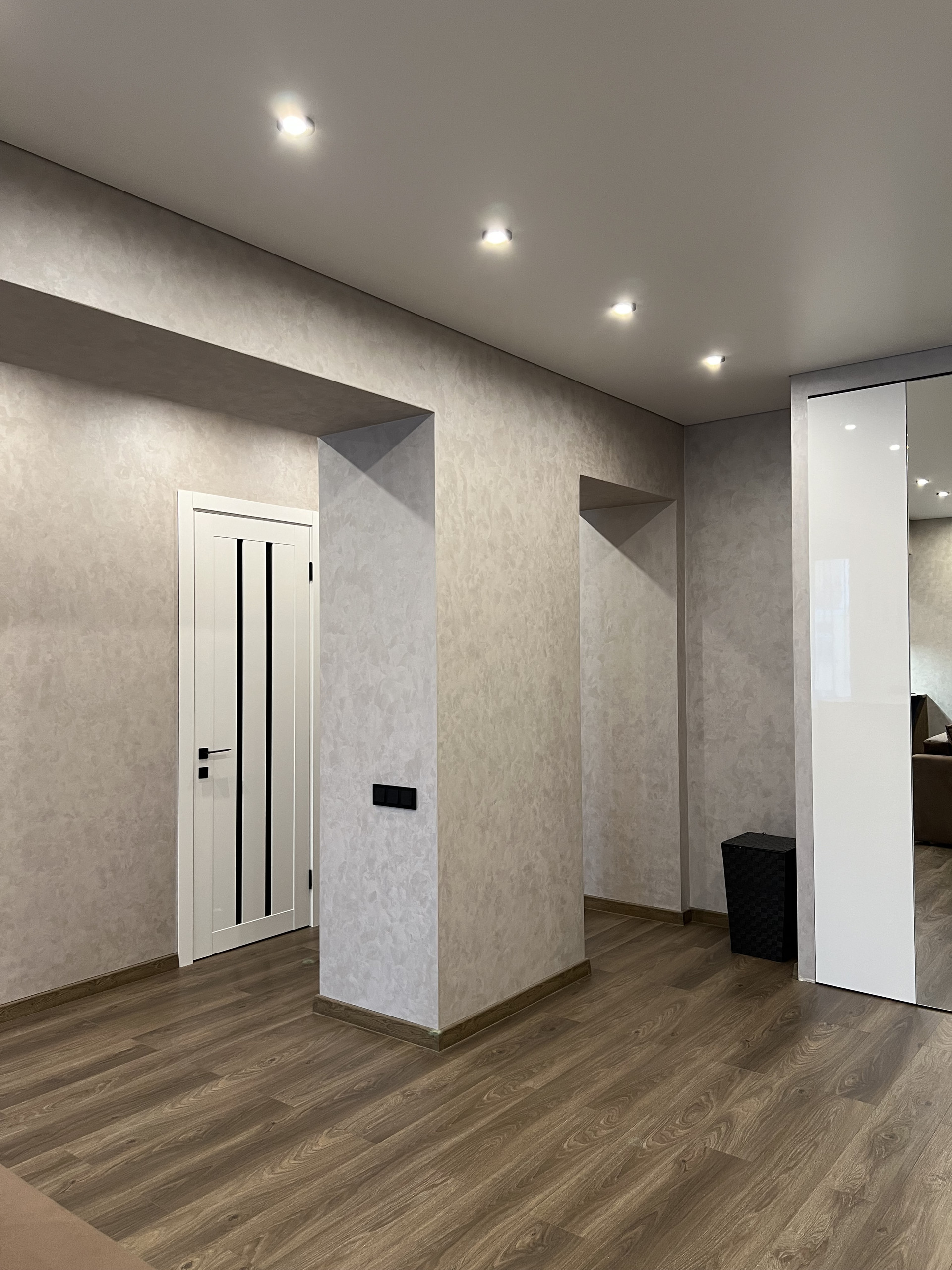 Установлено зональное освещение по всей квартире в современном теневом потолке.