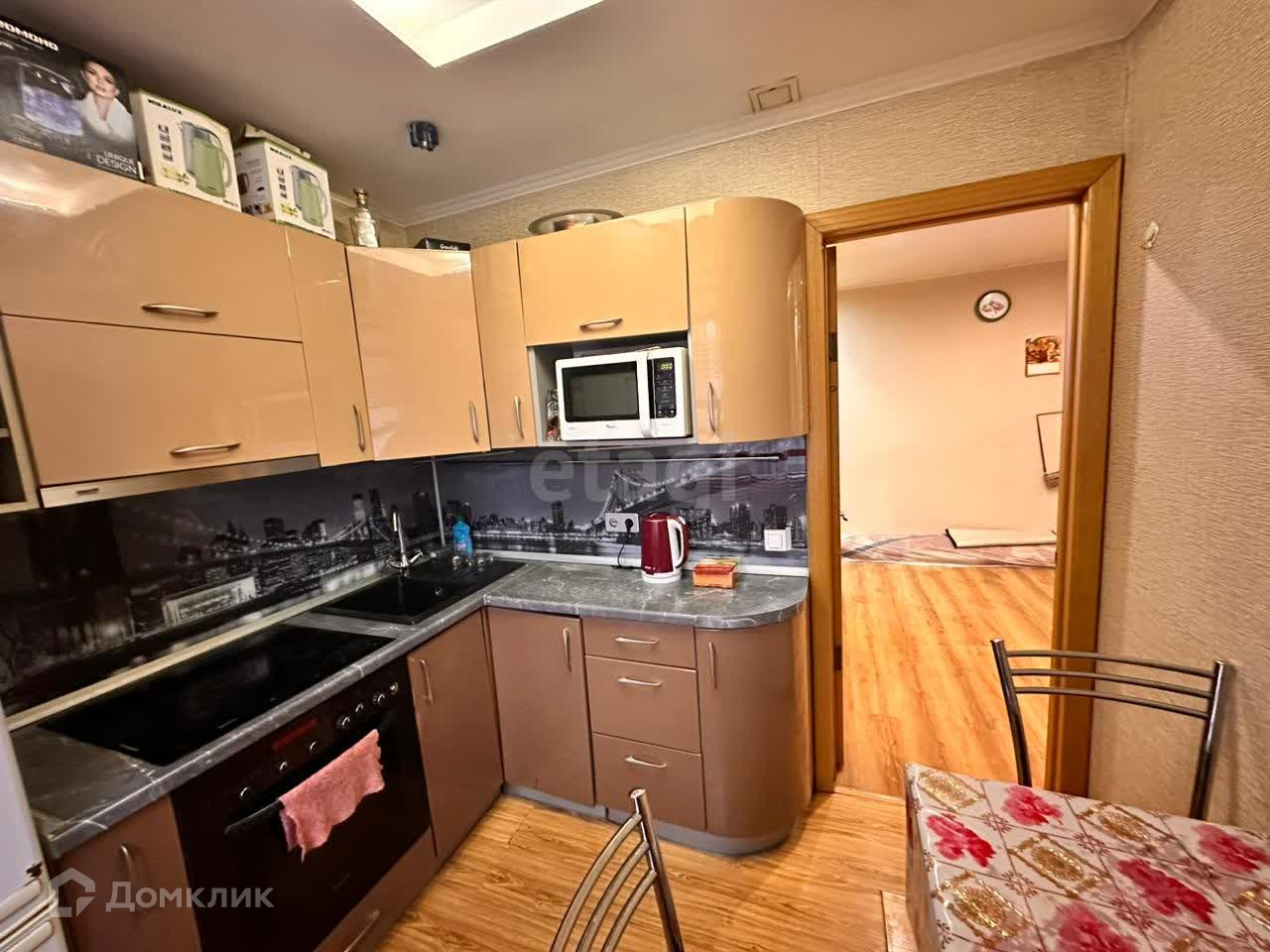 Имеется кухонный гарнитур, стол - стулья, чайник, микроволновка, плитка, кровать, диван, гардеробная, стиральная машина.