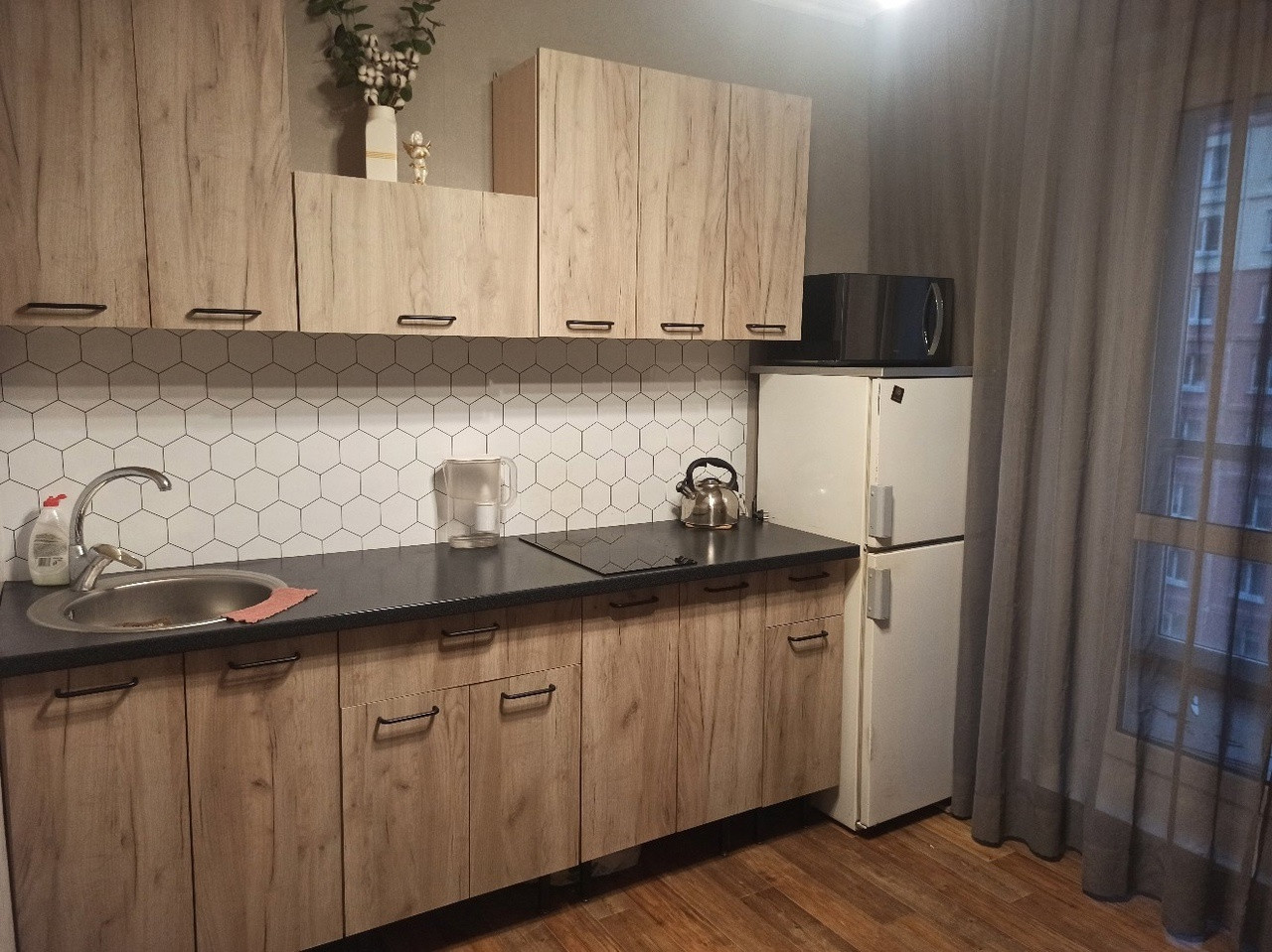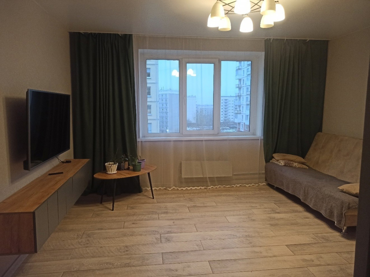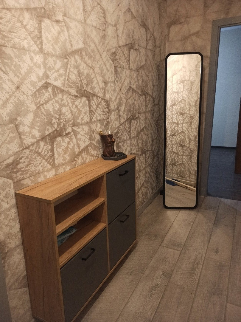 В кухне и гостиной ремонт делали год назад, все свежее и уютное. В коридоре новая входная дверь (без отделки).
