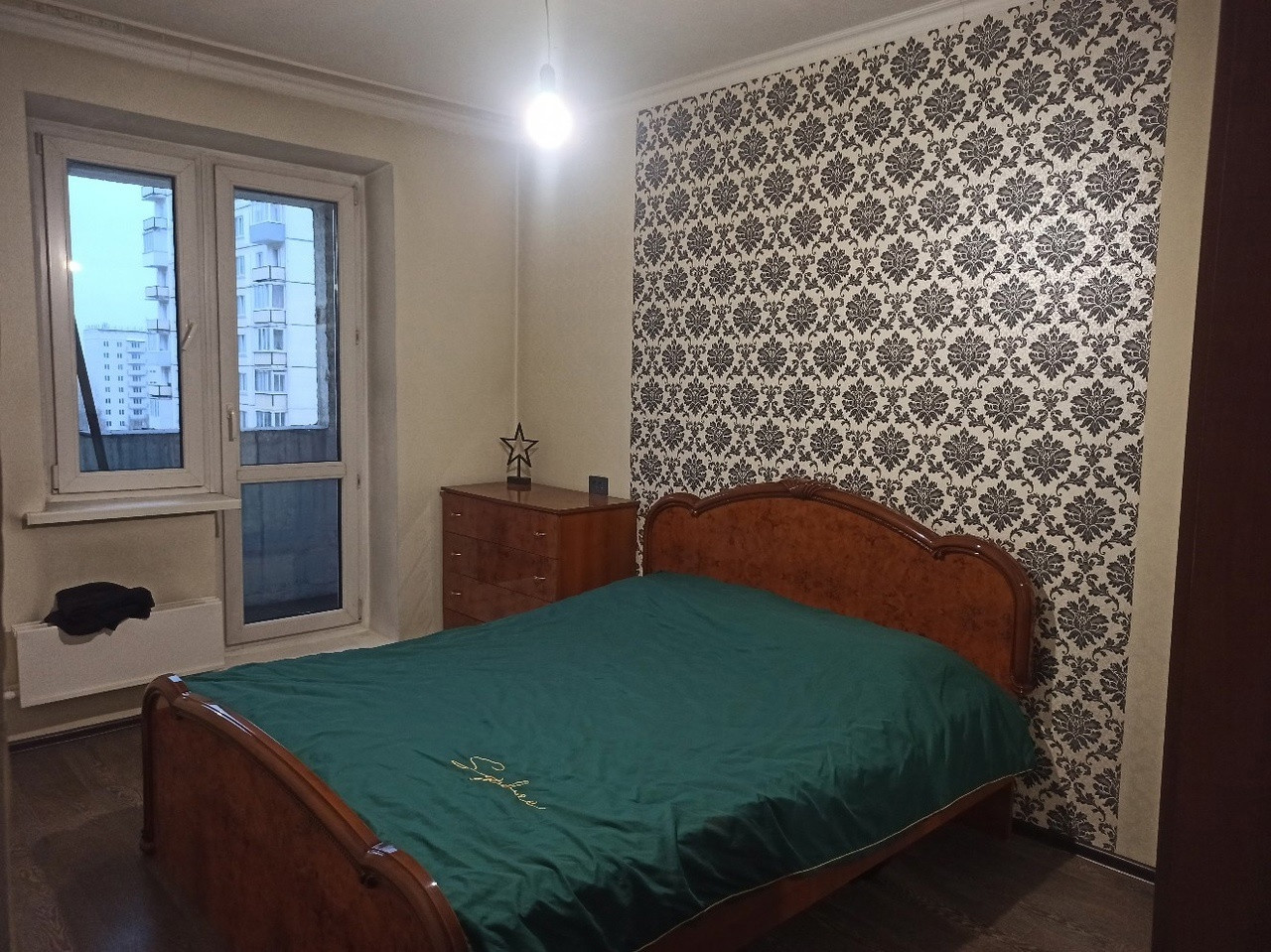 В спальне двуспальная кровать, комод, шкаф с зеркалом.