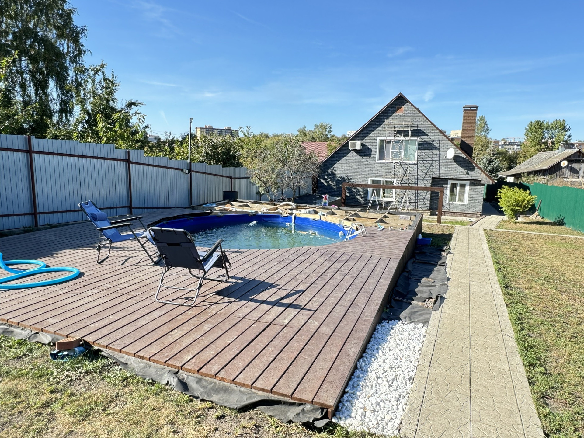 Установлен бассейн с дистанционным включением очистки, зона отдыха вокруг него из специально обработанной доски