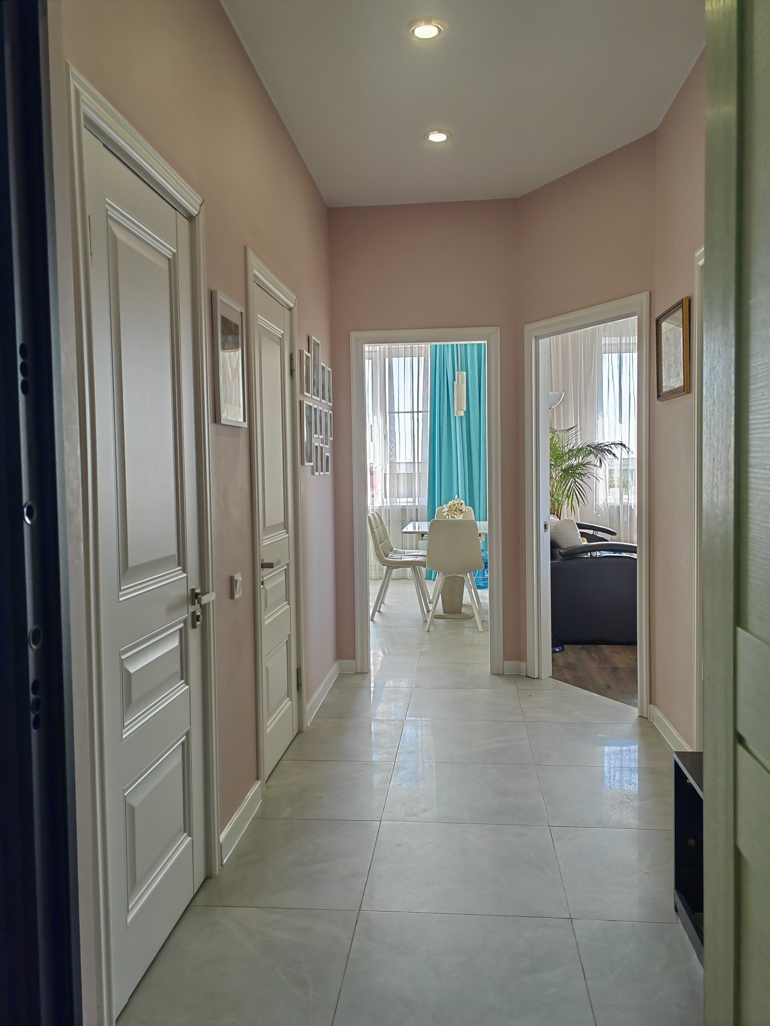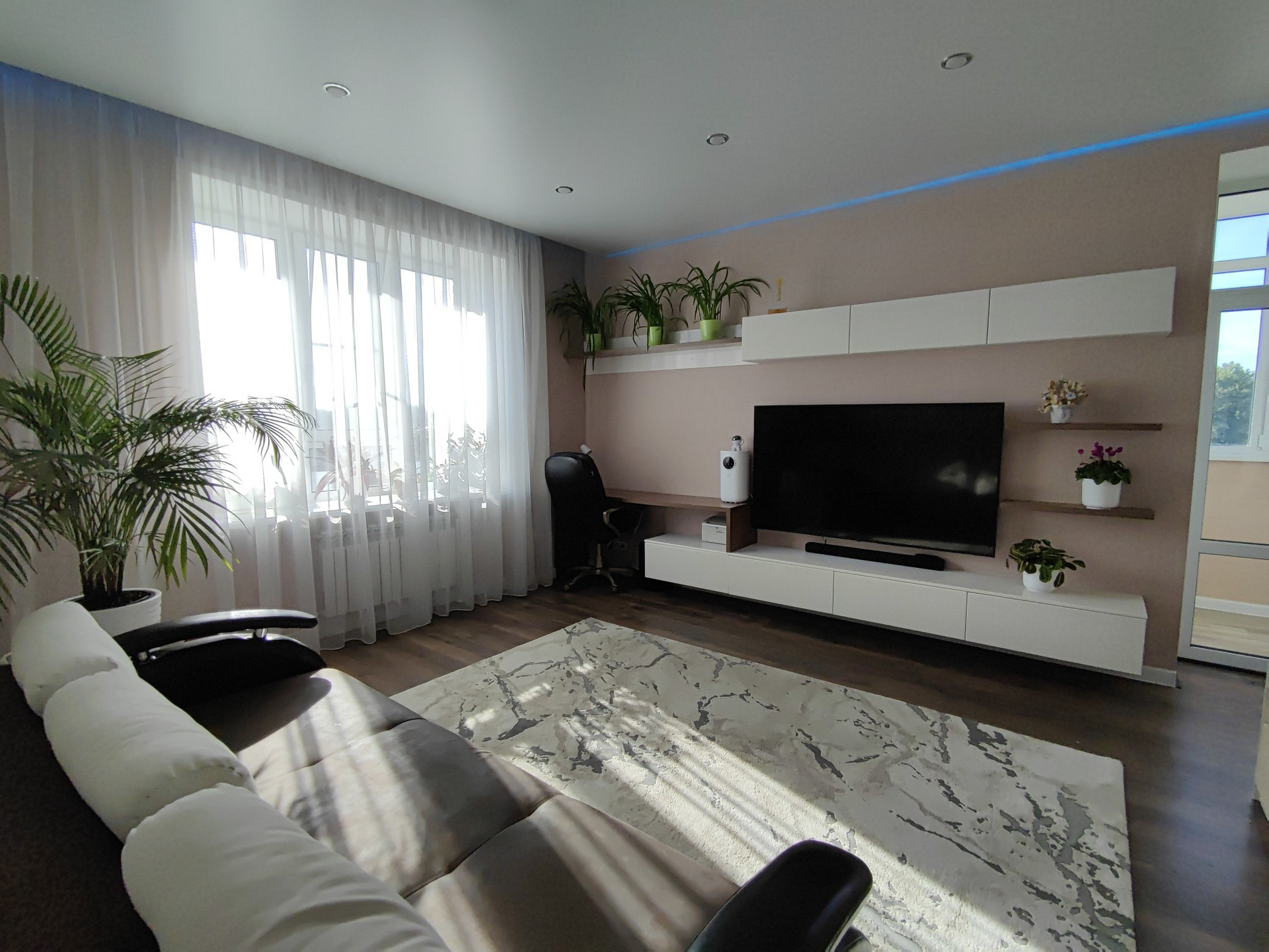 В гостиной телевизор 70 дюймов, саунд бар - все фирмы LG. Есть скрытая подсветка потолка, регулируется с помощью пульта.