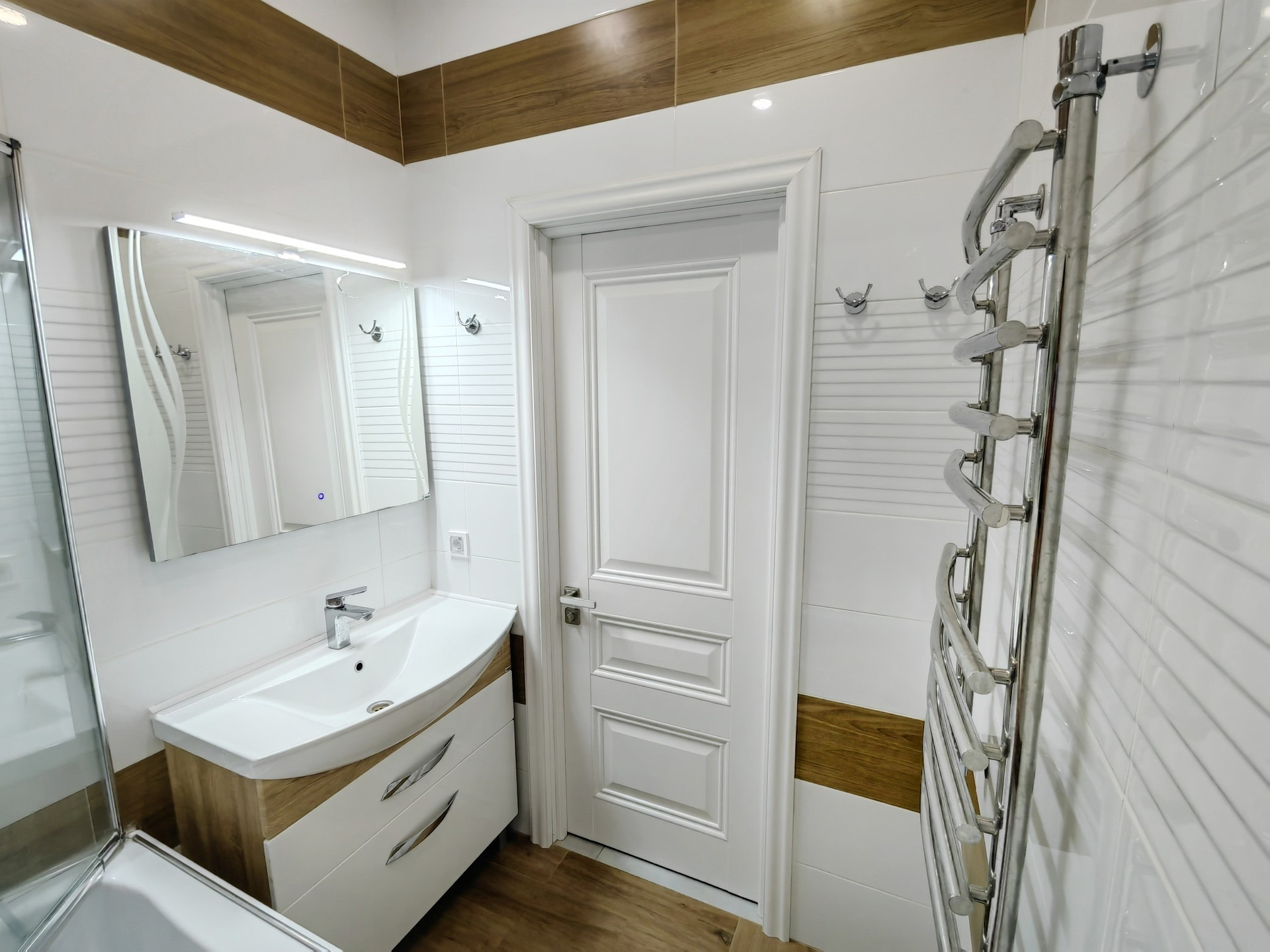 Есть теплый пол с датчиками регулировки: прихожая, ванная, кухня.