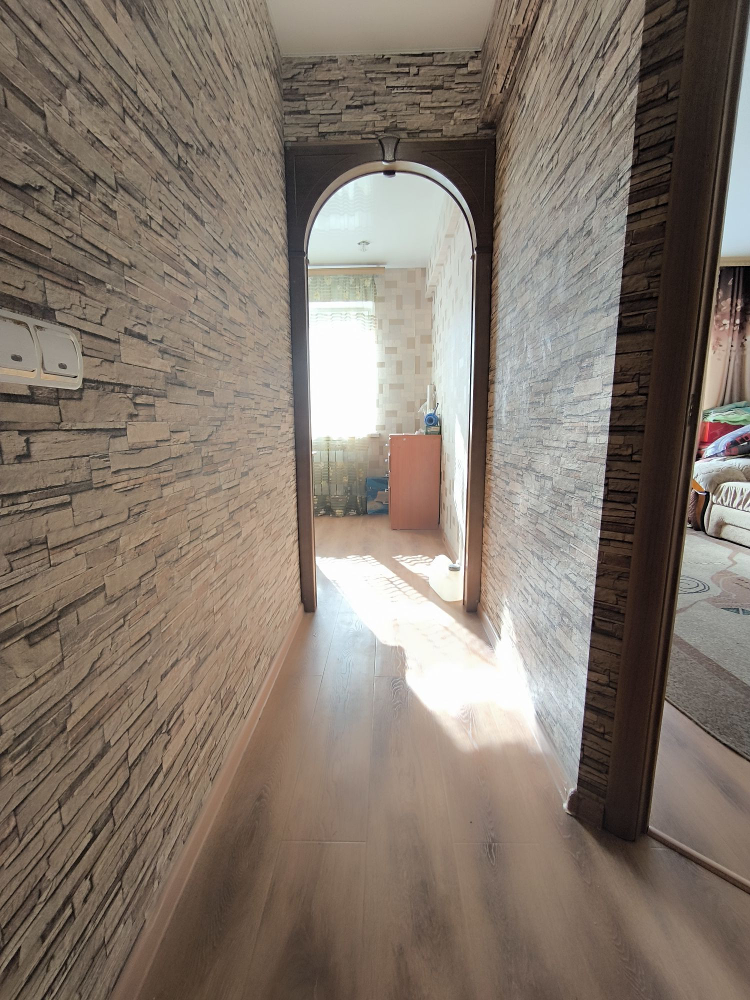 На полу ламинат ( полы заливали),ванна в плитке ,натяжные потолки ,пластиковые окна и АОГВ !