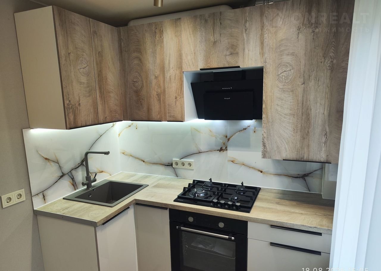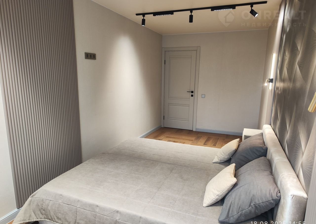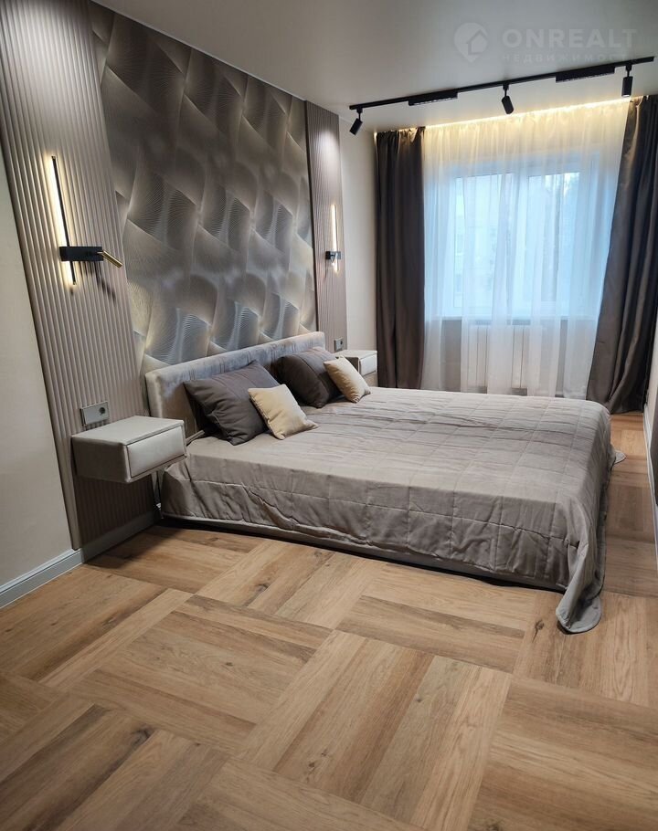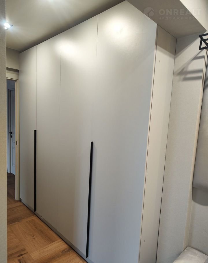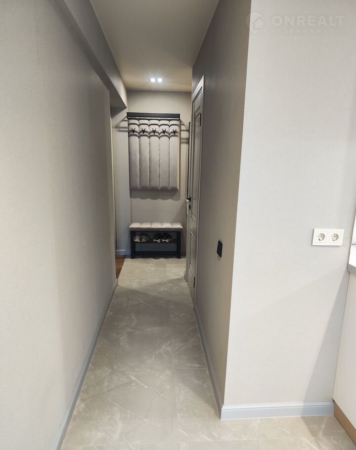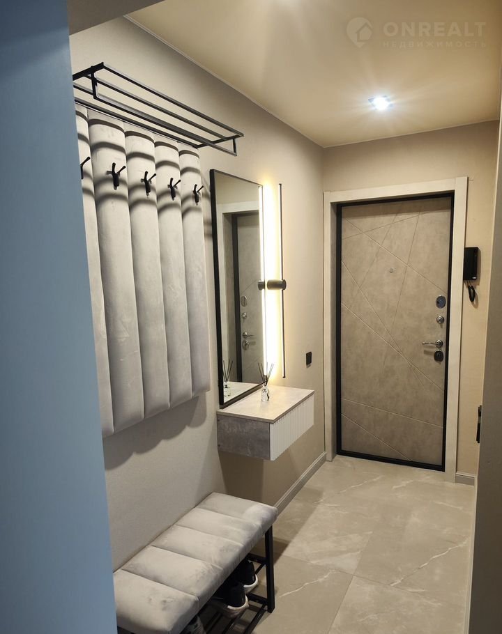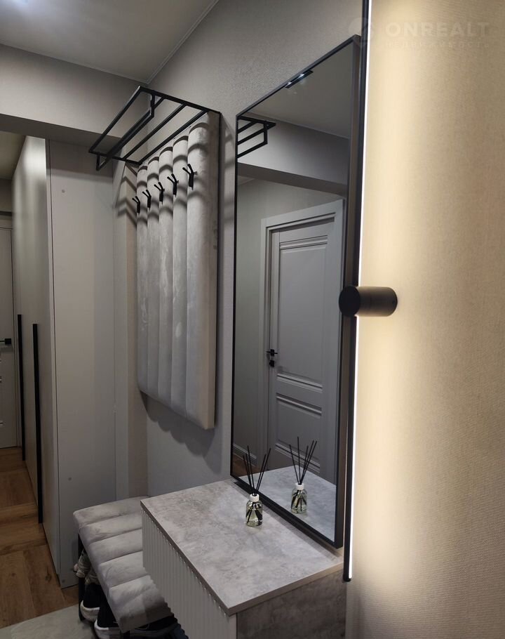 Из мебели: прихожая в коридоре, тумба для мелочей, вместительный шкаф (240 см шириной), кухонный гарнитур (с варочной поверхностью, духовым шкафом и вытяжкой), двухспальная кровать (спальное место 180х200), мягкие прикроватные тумбы;