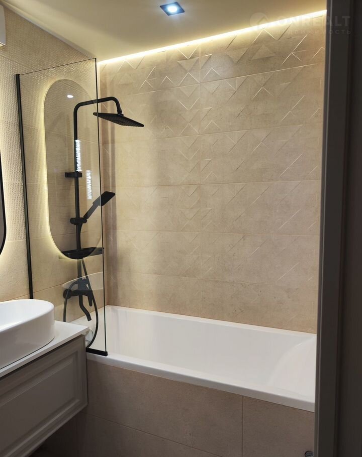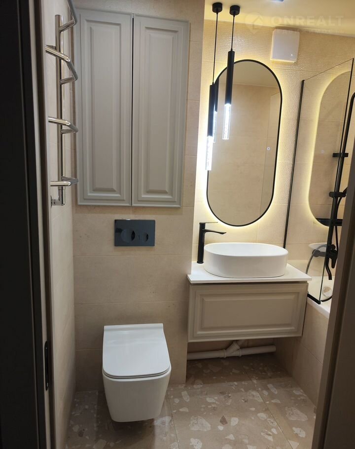 С/у отделан плиткой, установлена инсталляция, шторка для ванной из закаленного стекла, подвесная тумба с накладной раковиной, каркас для ванной усилен;