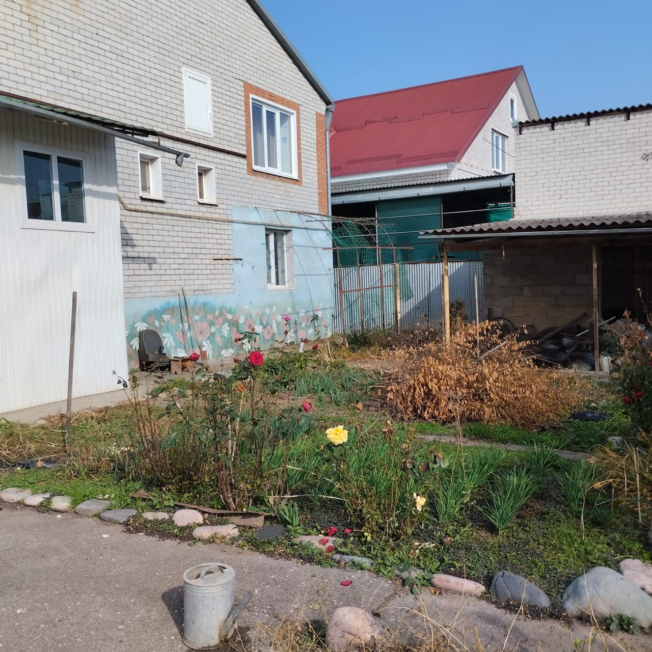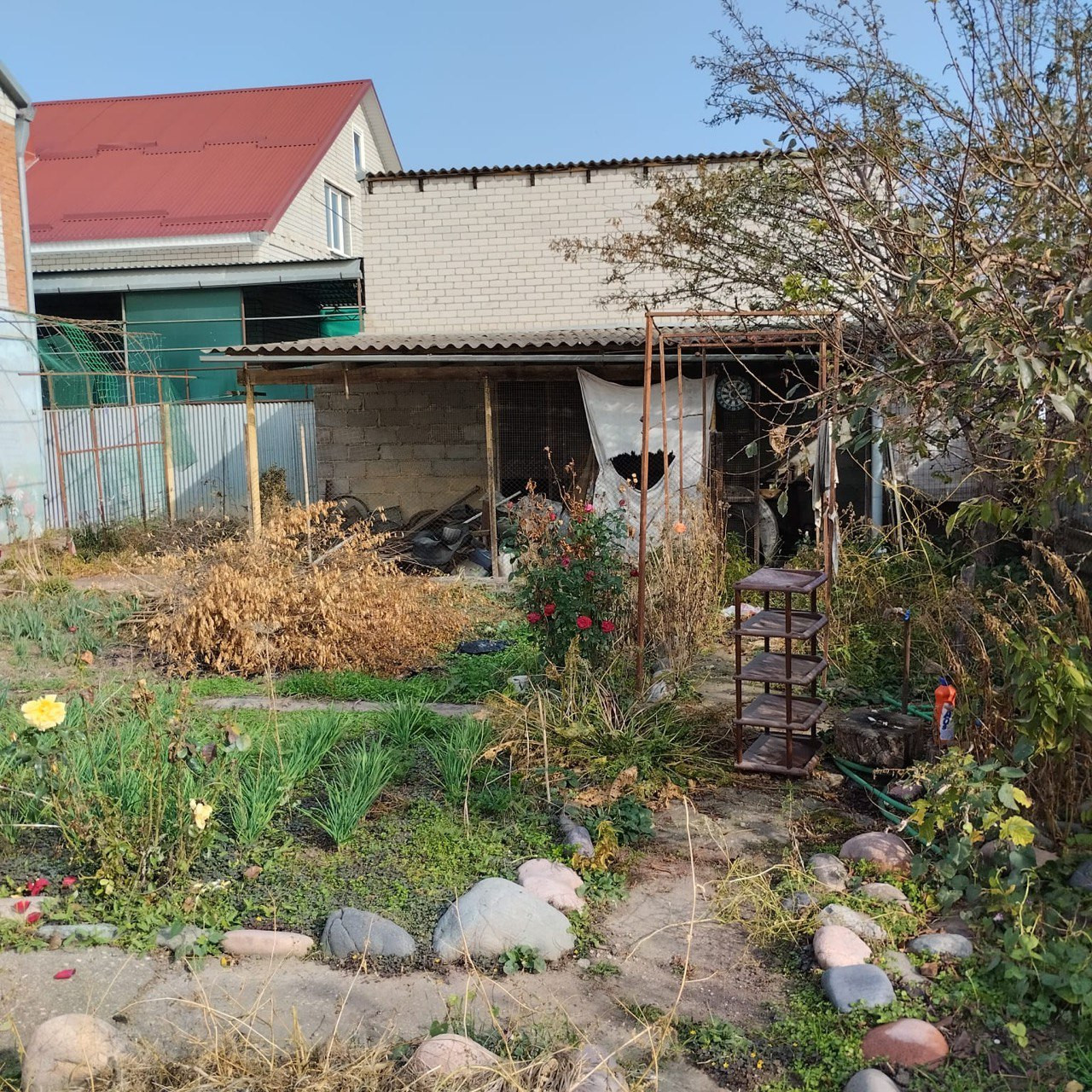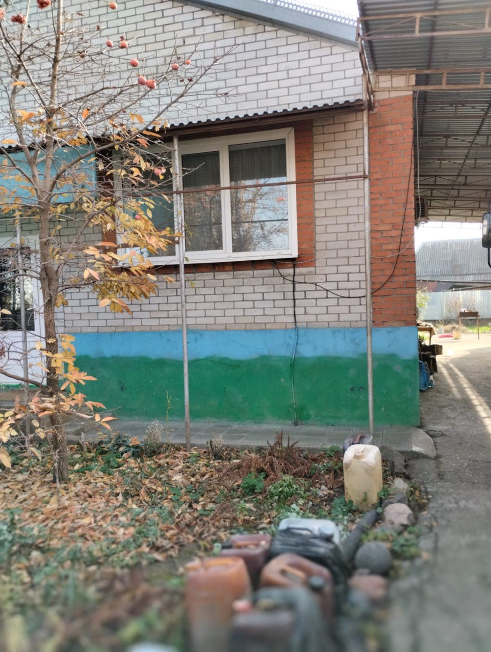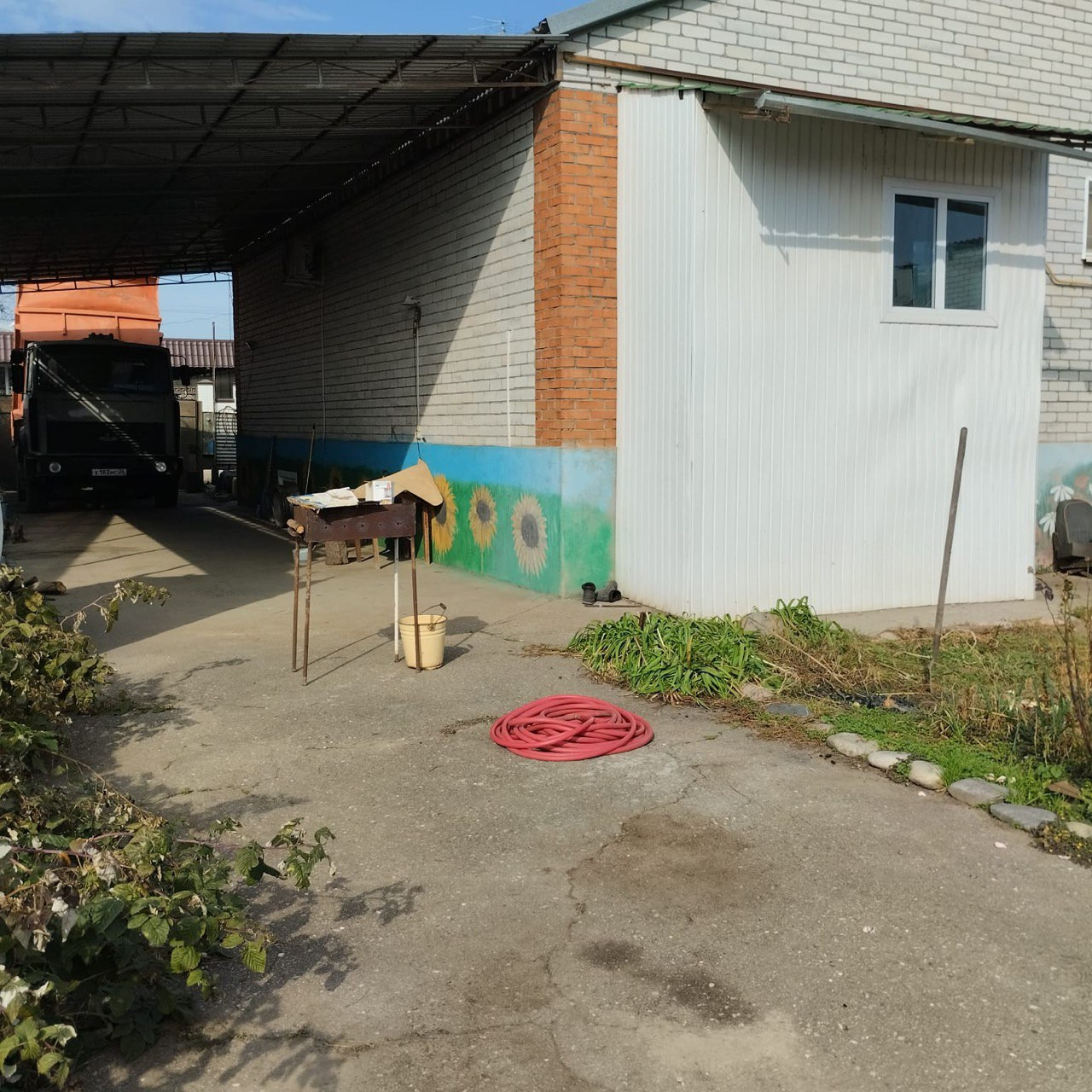 Асфальтированный двор. Есть навес. Во дворе хозпосторойка для животных. Рядом установлен кран с холодной водой. Гараж,оснащен смотровой ямой.