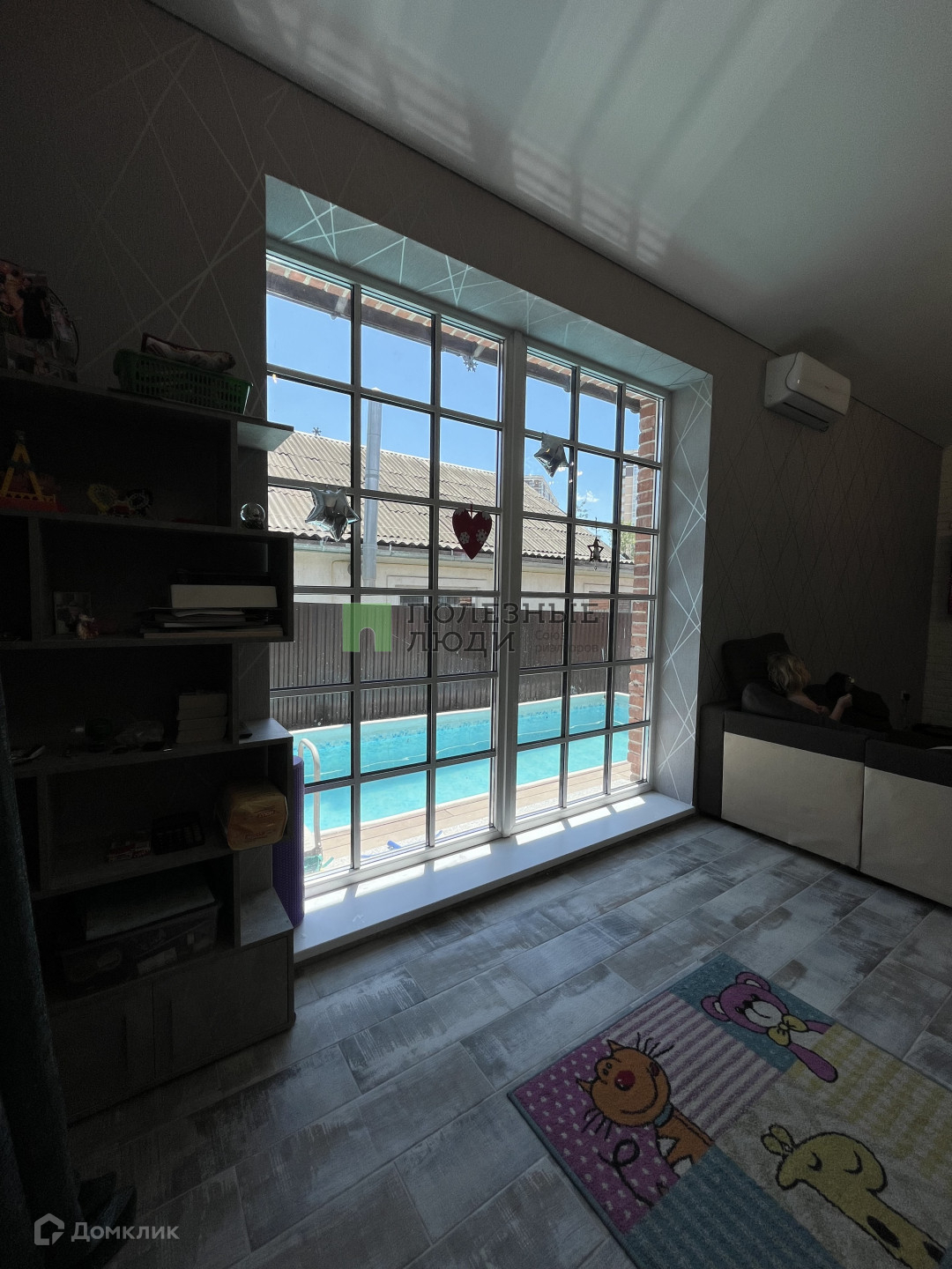 Два входа, с мансарды и торца дома. Три комнаты+ кухня гостиная, сан узел, душевая,  комната под баню (есть печь для бани), с бани отдельный выход к бассейну.