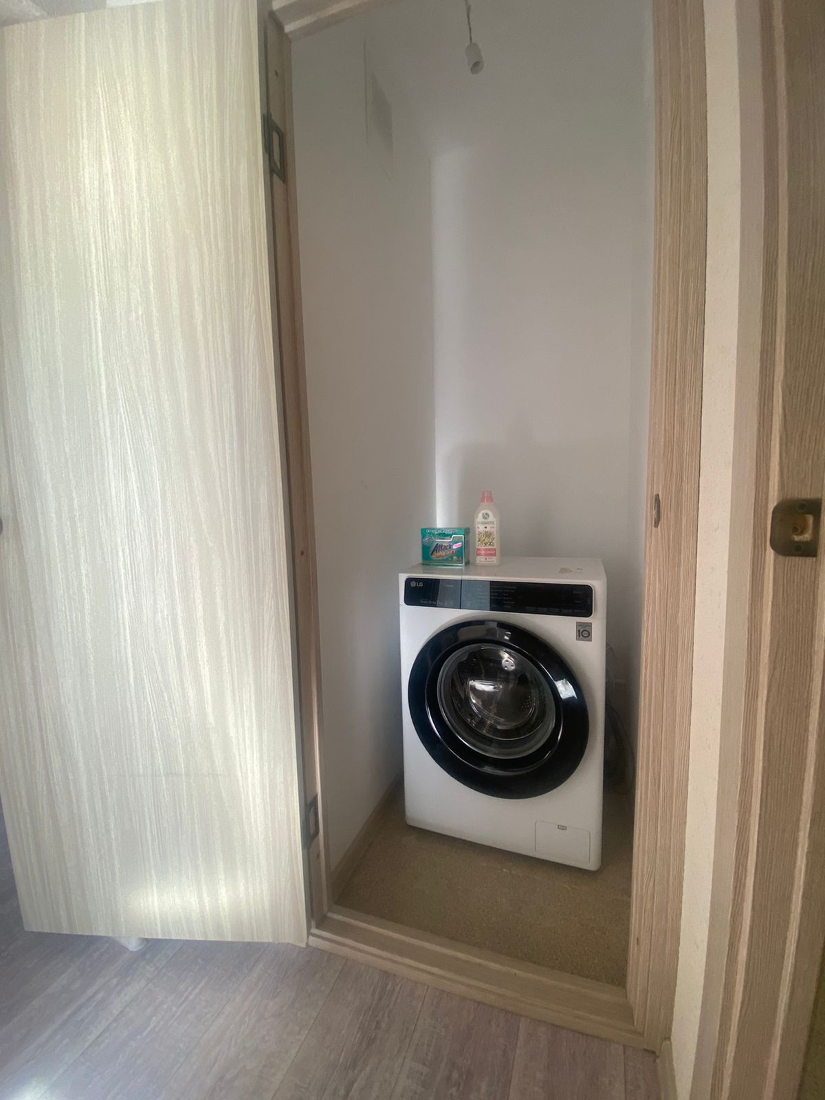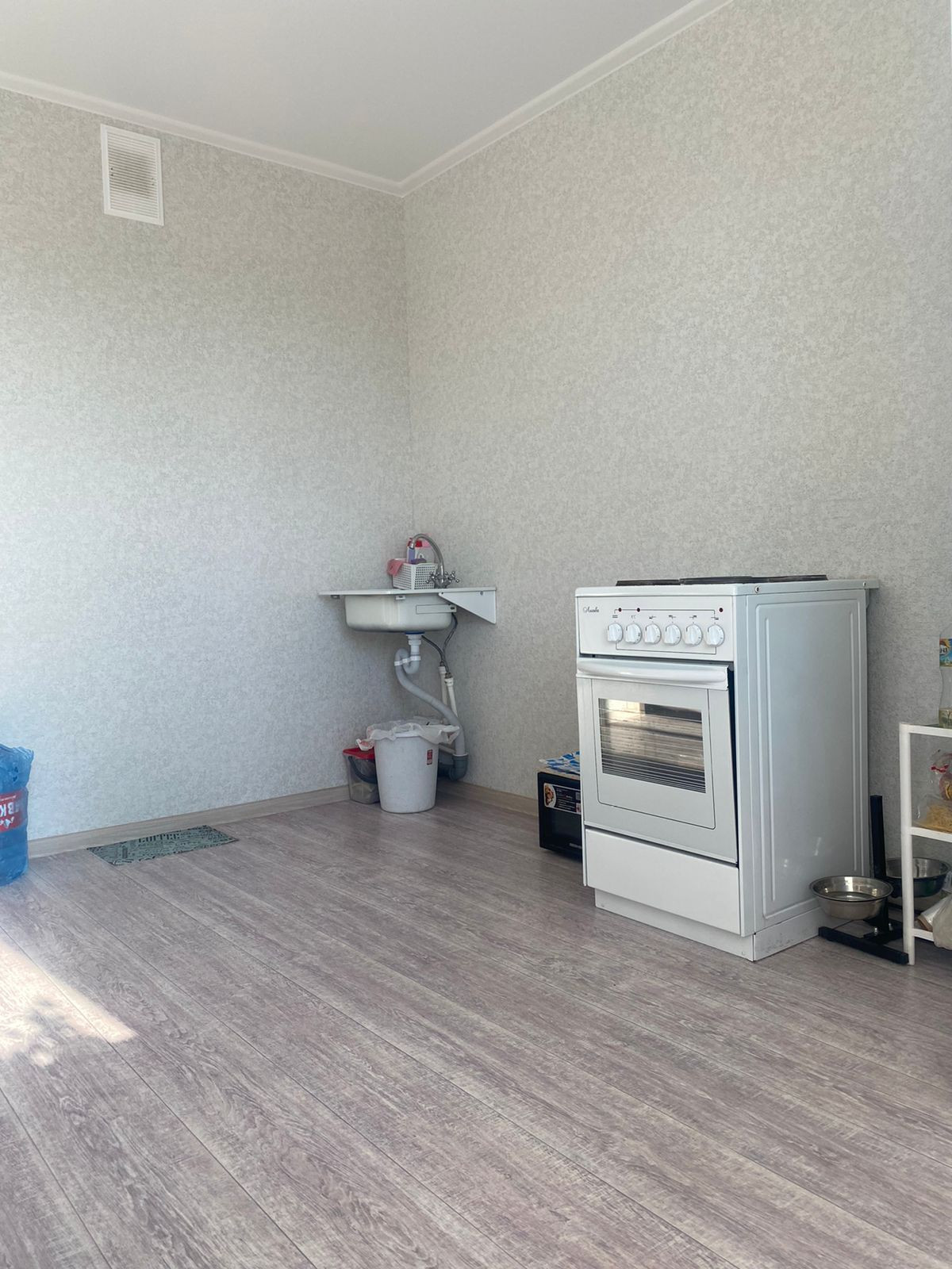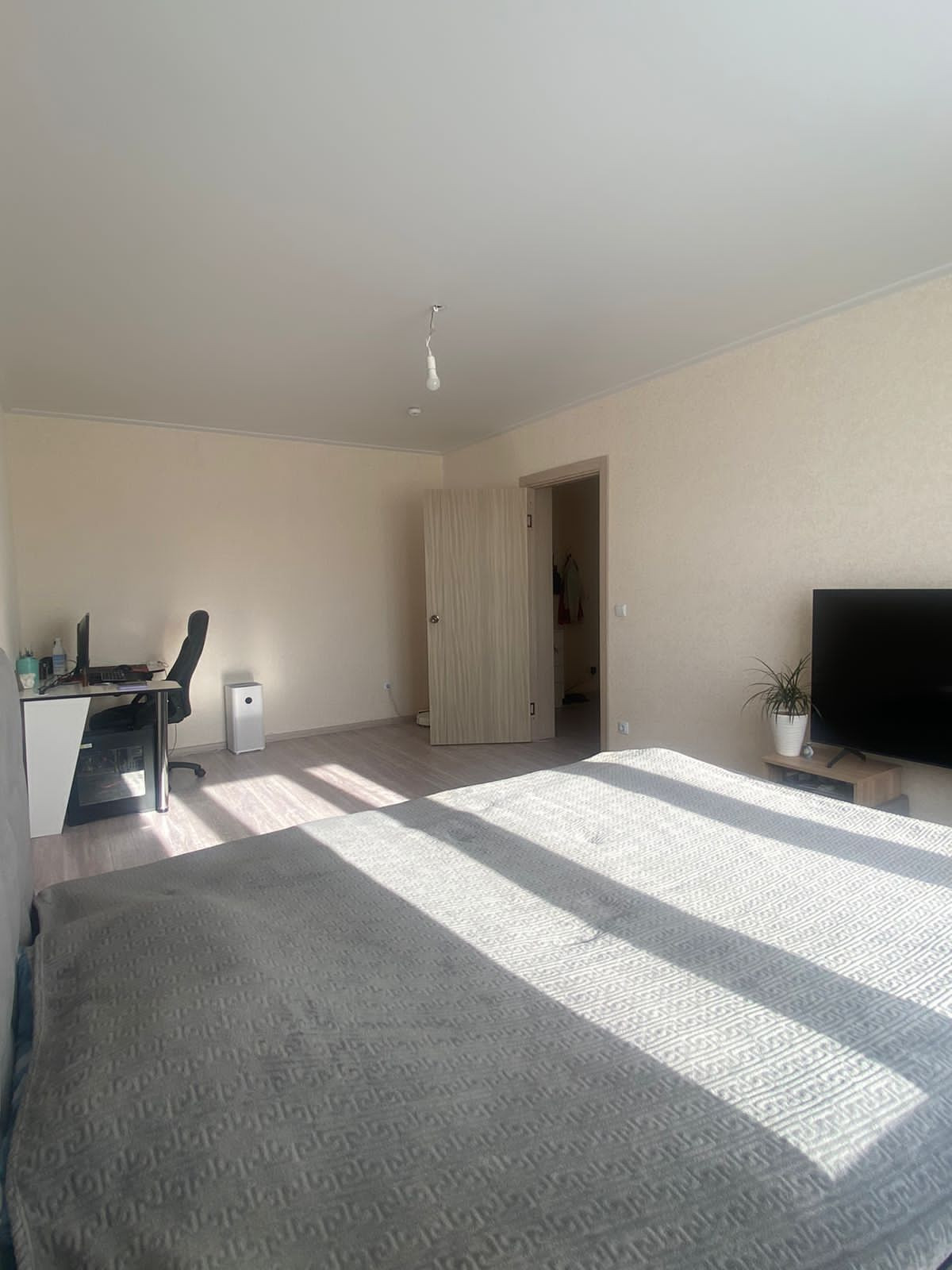 В продаже квартира с ремонтом от застройщика, всё в светлых тонах: натяжные потолки, на полу линолеум, на стенах виниловые обои, межкомнатные двери, установлена сантехника, электроплита.