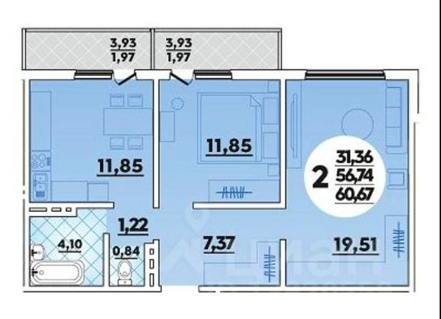 Общая площадь 60.7 м2
