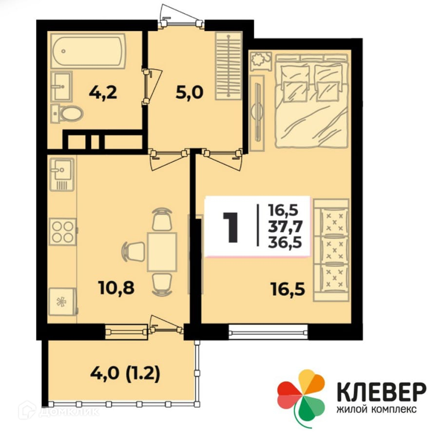 Общая площадь квартиры: 37,7 кв.м., жилая площадь: 16,5 м.кв., кухня 10,8 м.кв.
