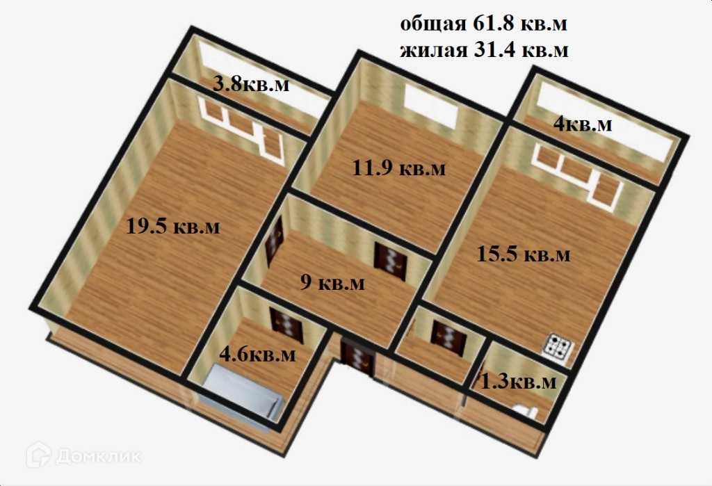 Общая площадь квартиры 61.8 кв.м, с лоджией и балконом 70 кв.м, жилая 31.4 кв.м. – комнаты изолированные 19.5, 11.9 кв.м, кухня 15.5 кв.м. Санузел раздельный. Просторные остекленные лоджия и балкон.