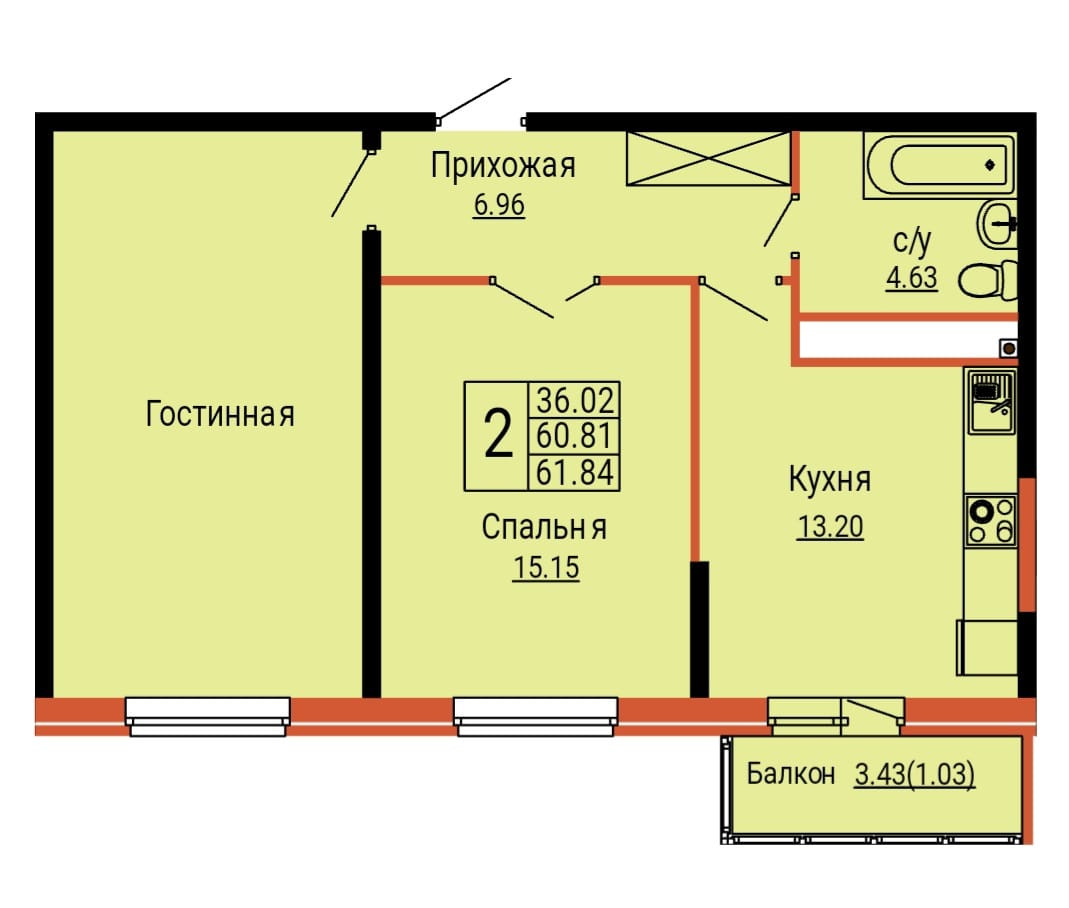 Общая площадь 61.9 м2