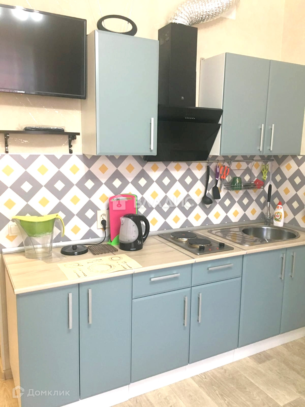 В комнате на полу - ламинат, потолок - натяжной, на стенах - обои. Новый кухонный гарнитур, кондиционер, холодильник, телевизор.