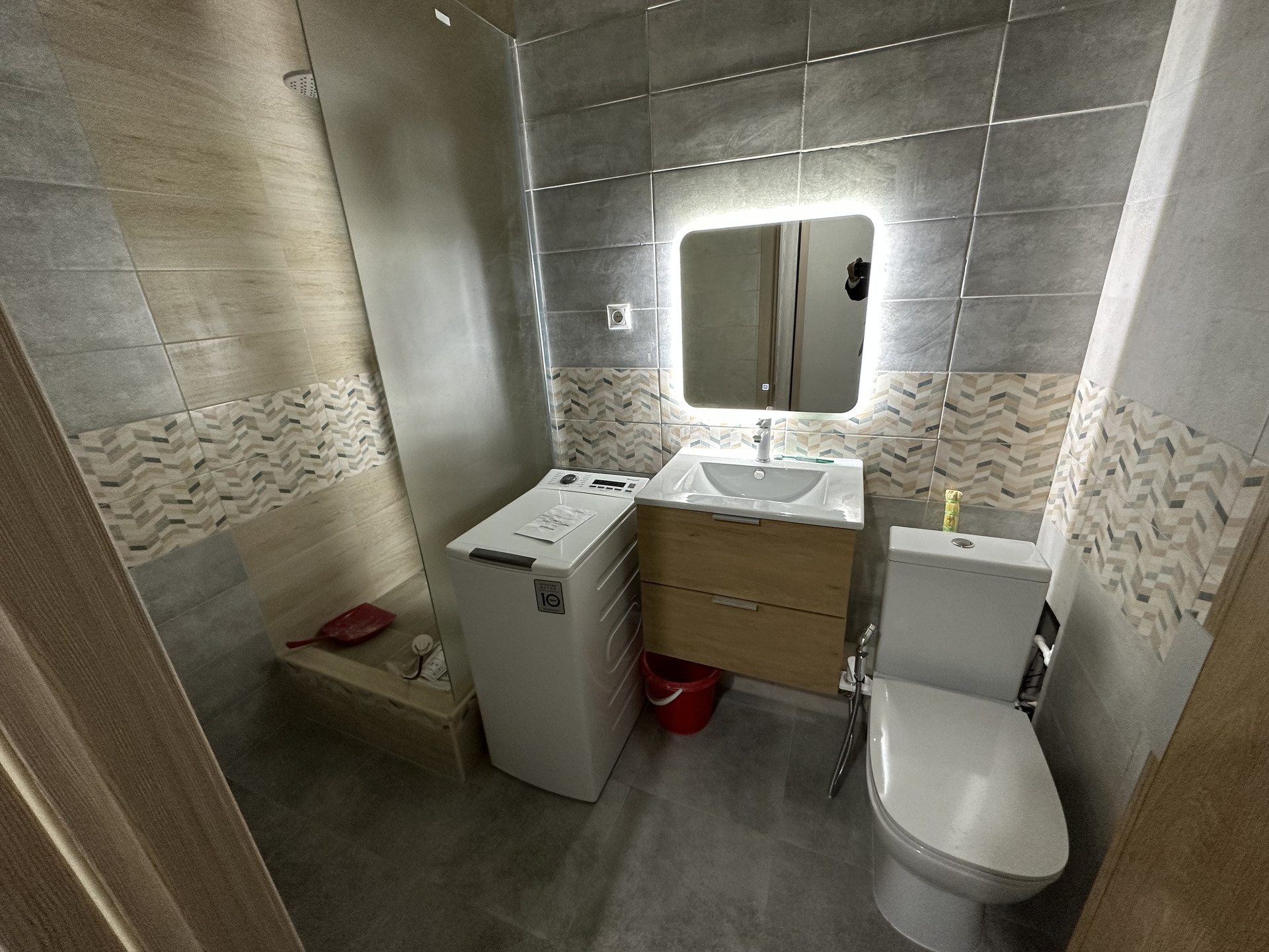 - полностью готова ванная комната, пол из кварцвинила Германия, гарантия 30 лет, доставлено из Москвы, в Краснодарском крае такого класса кварцвинила нет