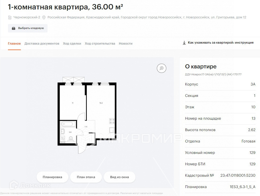 1-комнатная квартира, 33.1 м2, этаж 13 / 16, на продажу в Новороссийске, улица Григорьева, 12к1