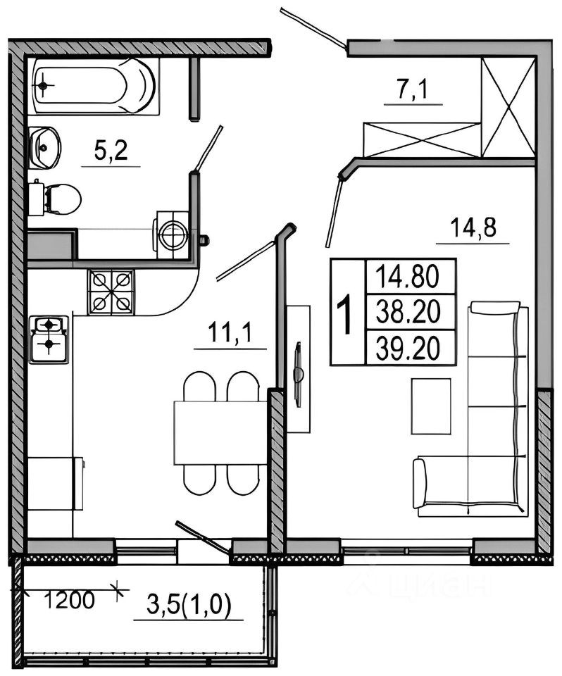 Балкон, лоджия 1 балкон