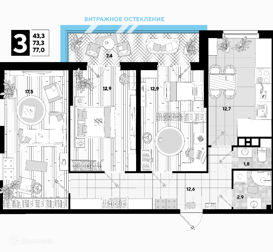Жилая площадь 43.3 м2