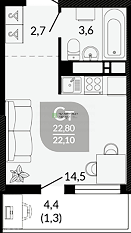 Жилая площадь 14.5 м2