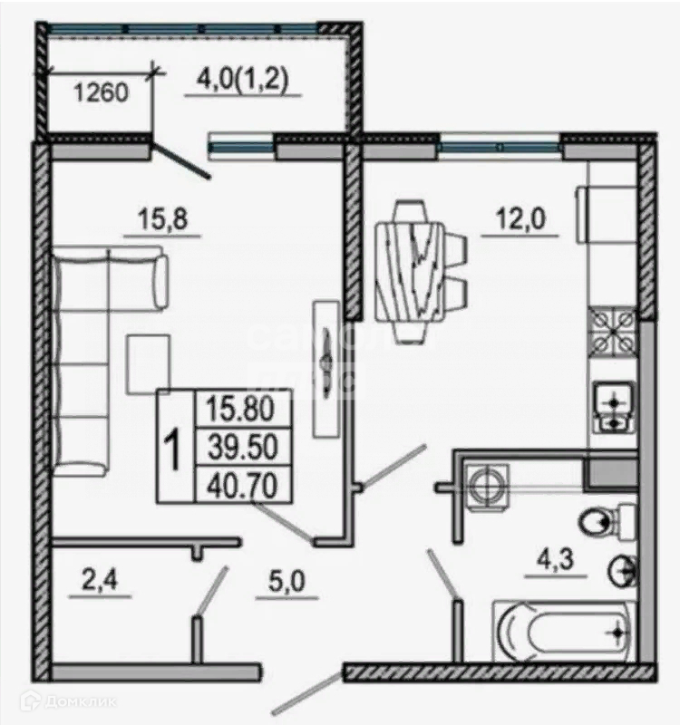 Общая площадь –39,5 кв.м;