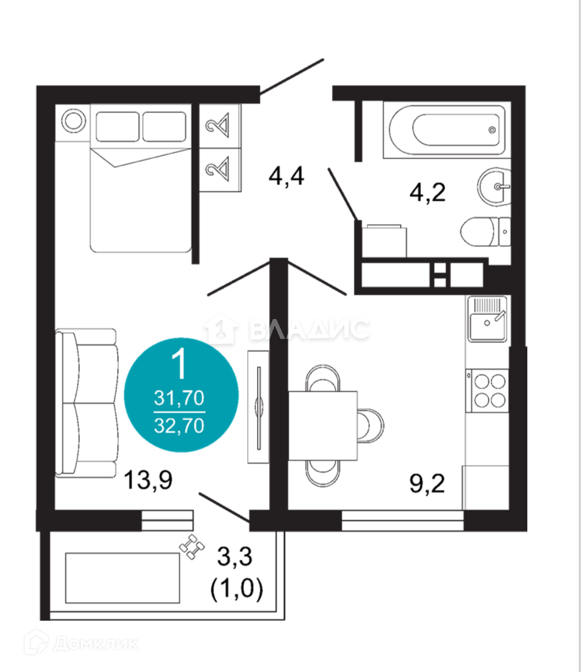 ● Общая площадь - 31,7 кв.м