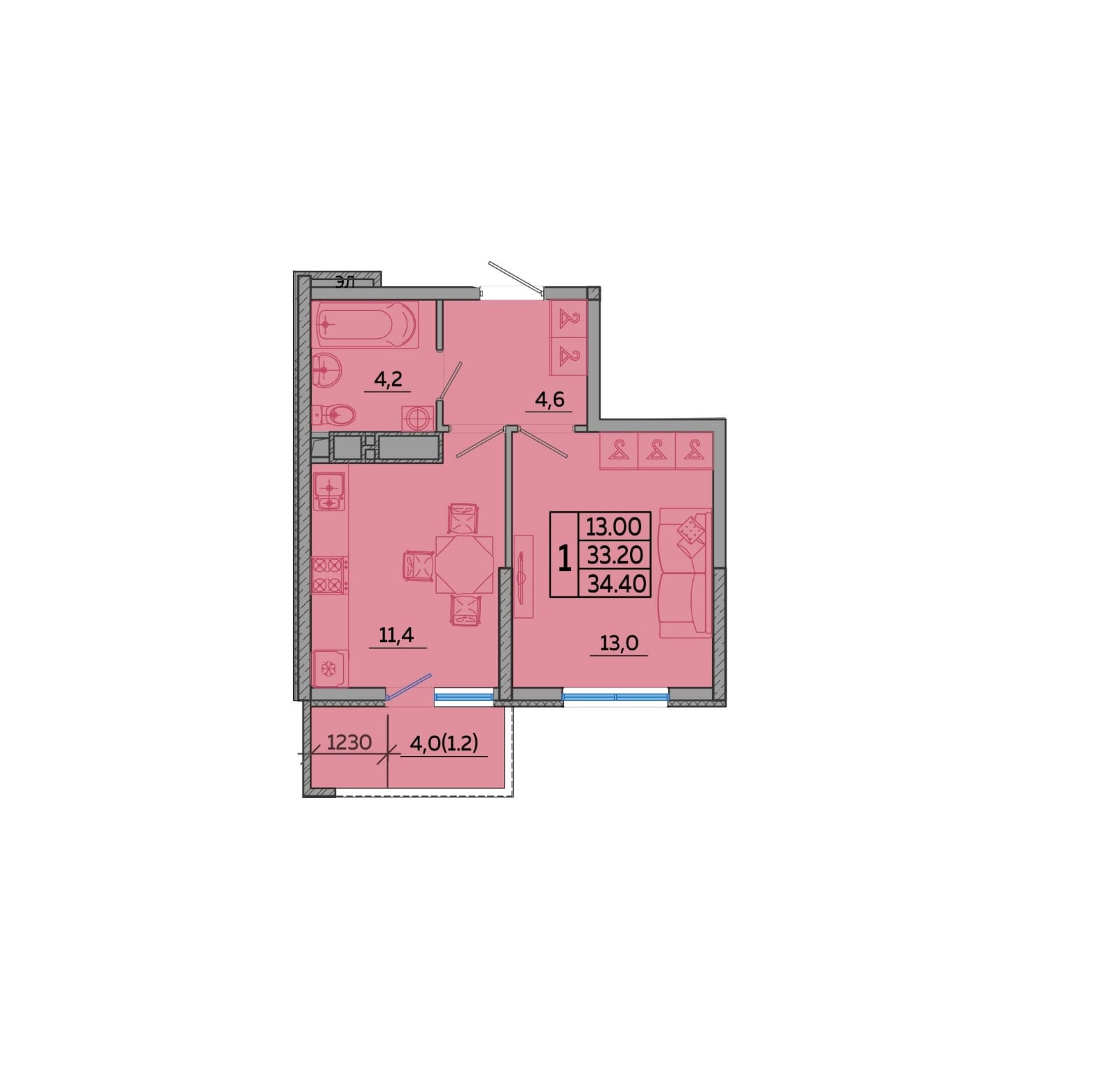 Общая площадь 33.2 м2