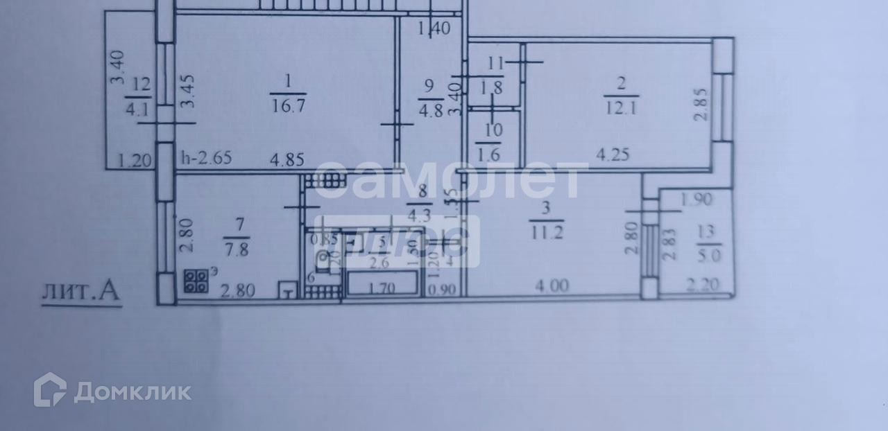 Общая площадь - 65 кв. м. Высота потолка - 2.65 см.