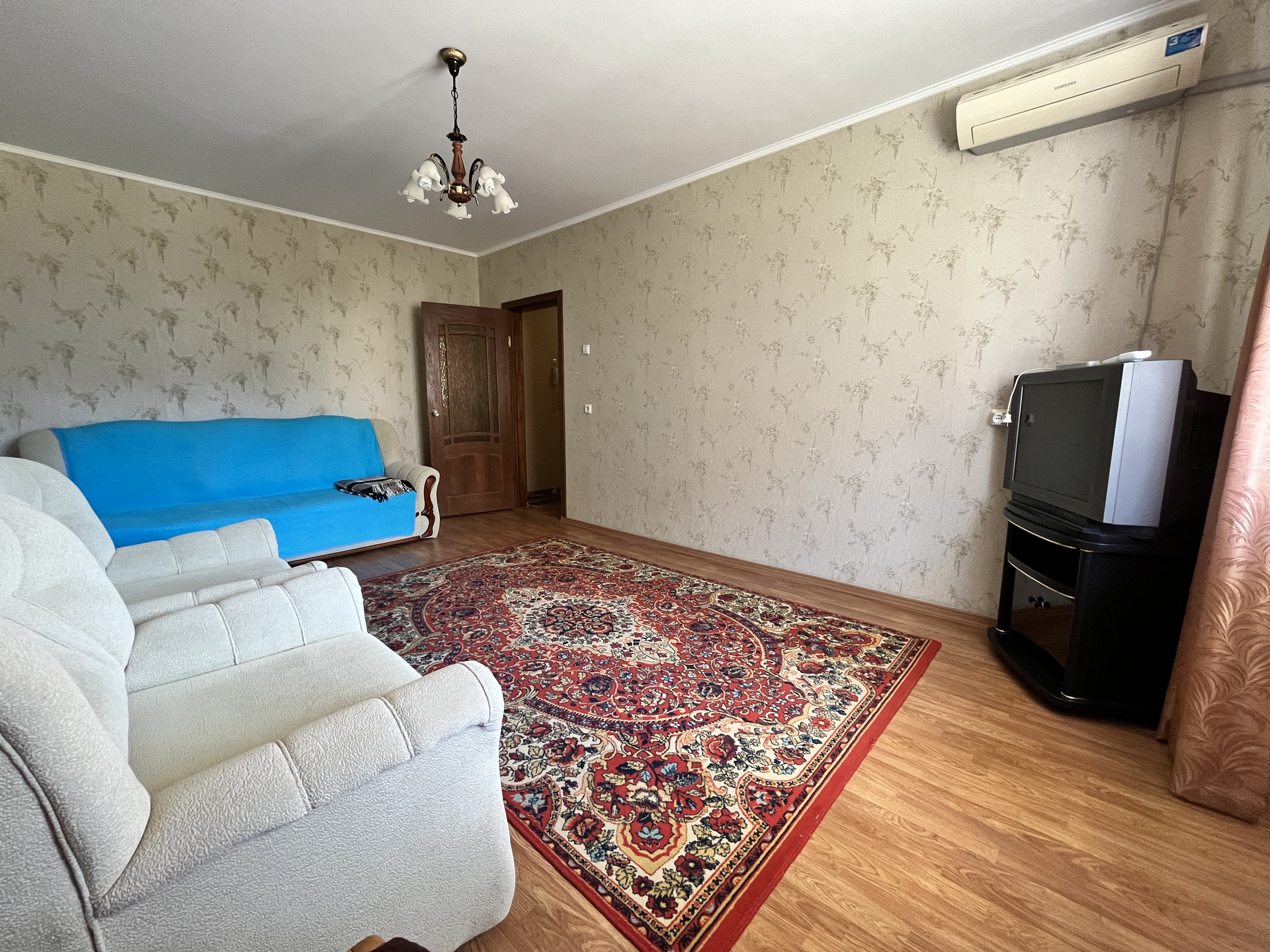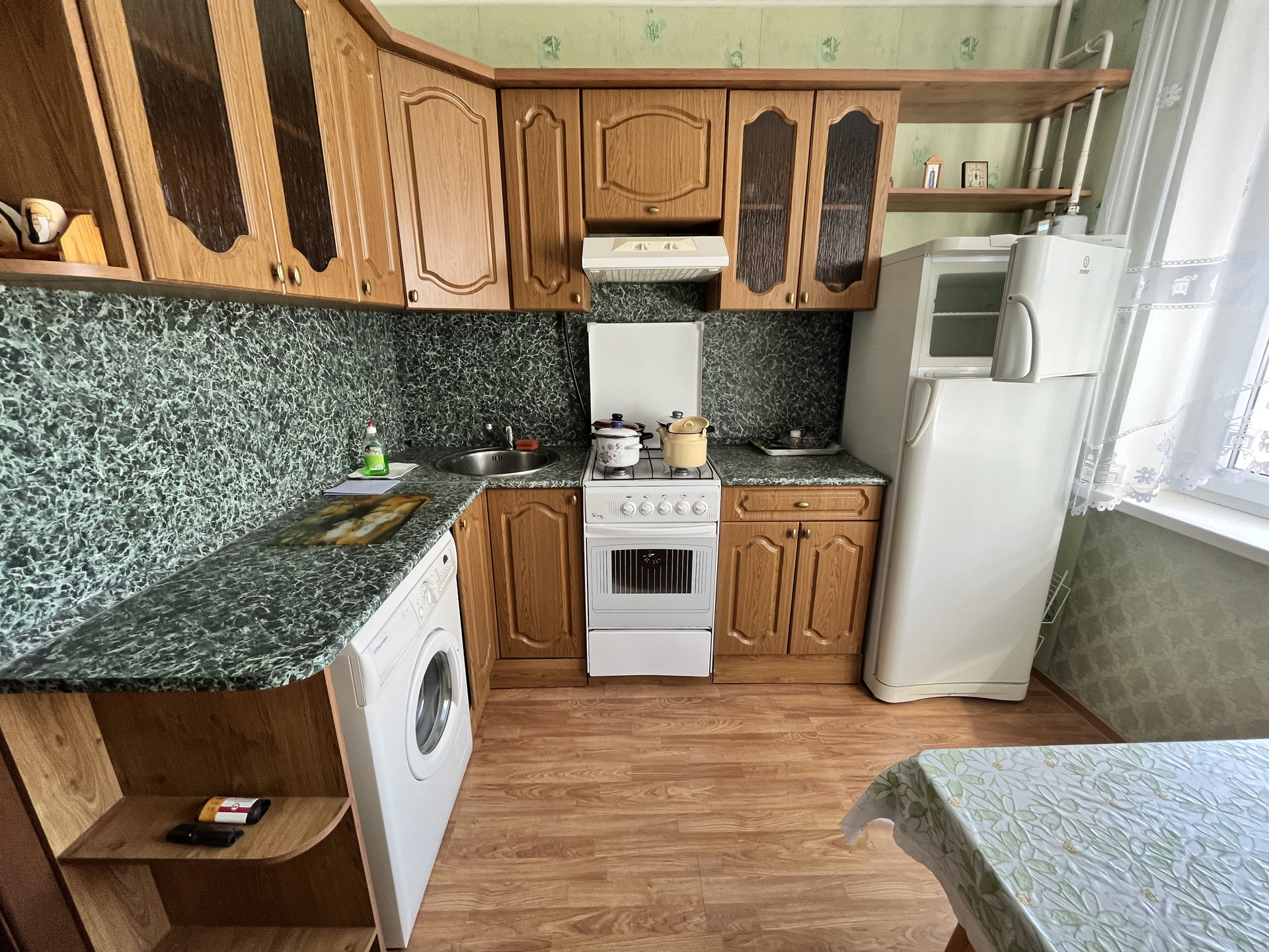 Бытовая техника: холодильник, газовая плита, духовка, вытяжка, стиральная машина, телевизор, сплит-система, утюг.