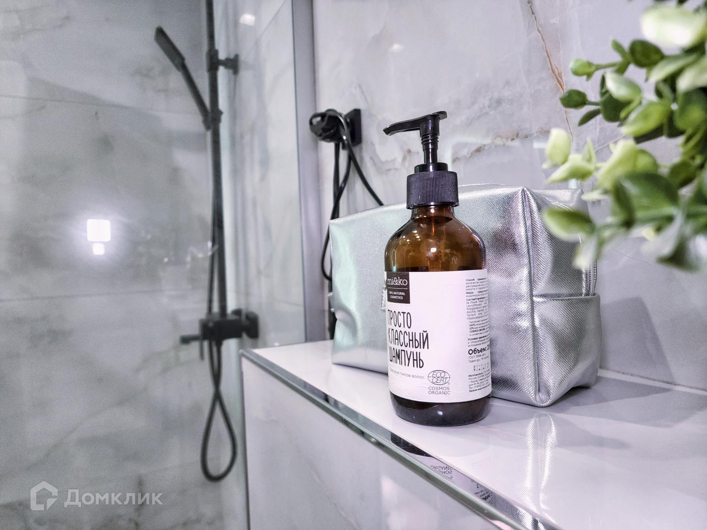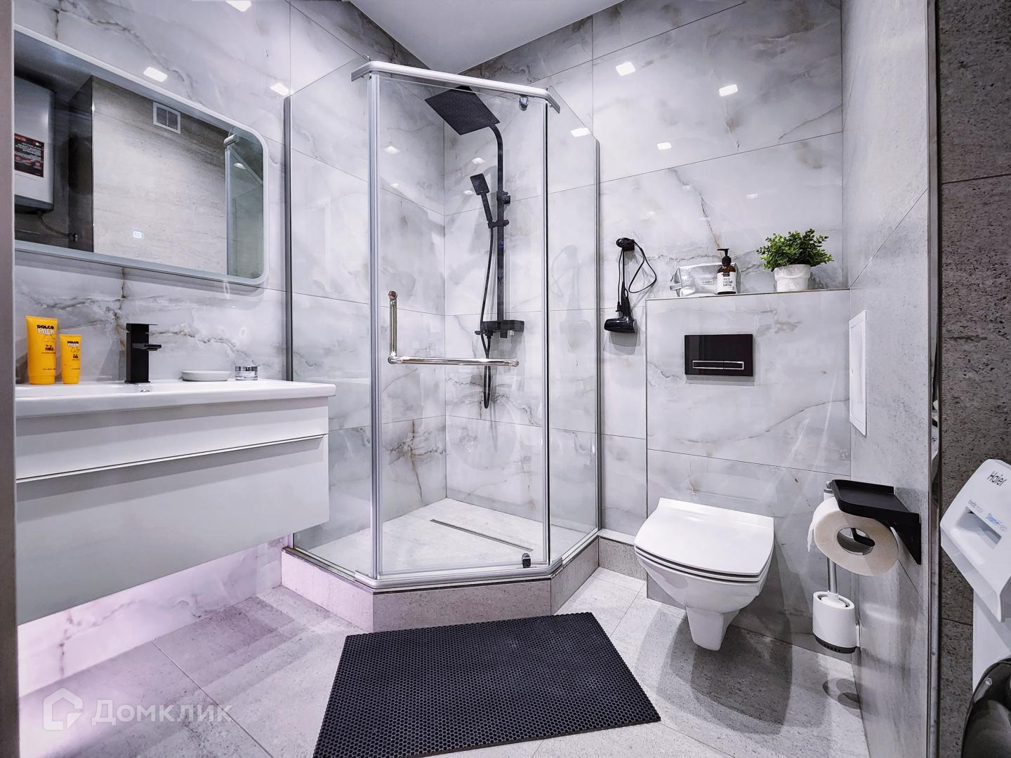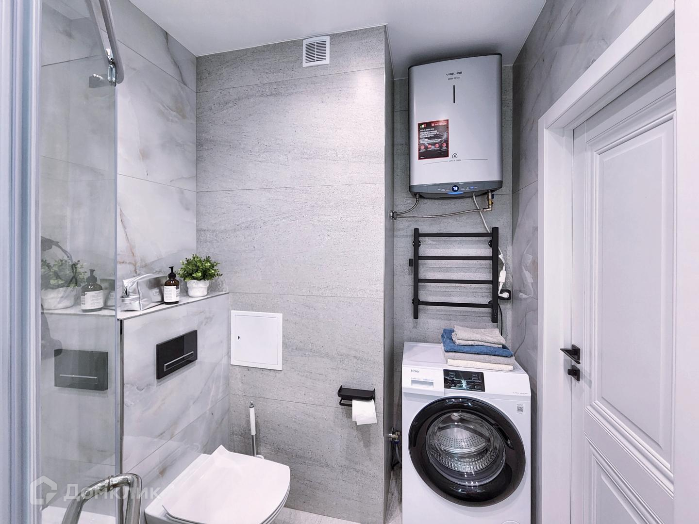 — Ванная комната с душем, стиральной машиной и феном
