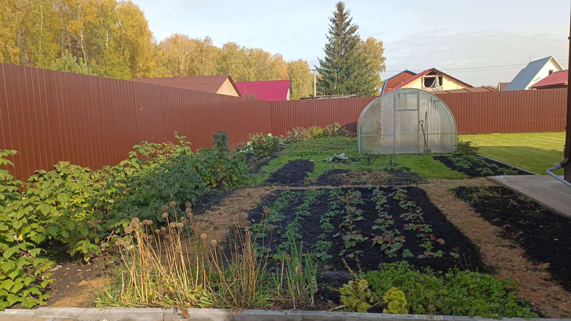 Участок огорожен высоким забором, что позволяет свободно себя чувствовать без лишних глаз. Вся территория зонирована: есть отдельно зона посадок с теплицей (6*3), идеальный газон для отдыха и активностей с детками и зона парковки.
