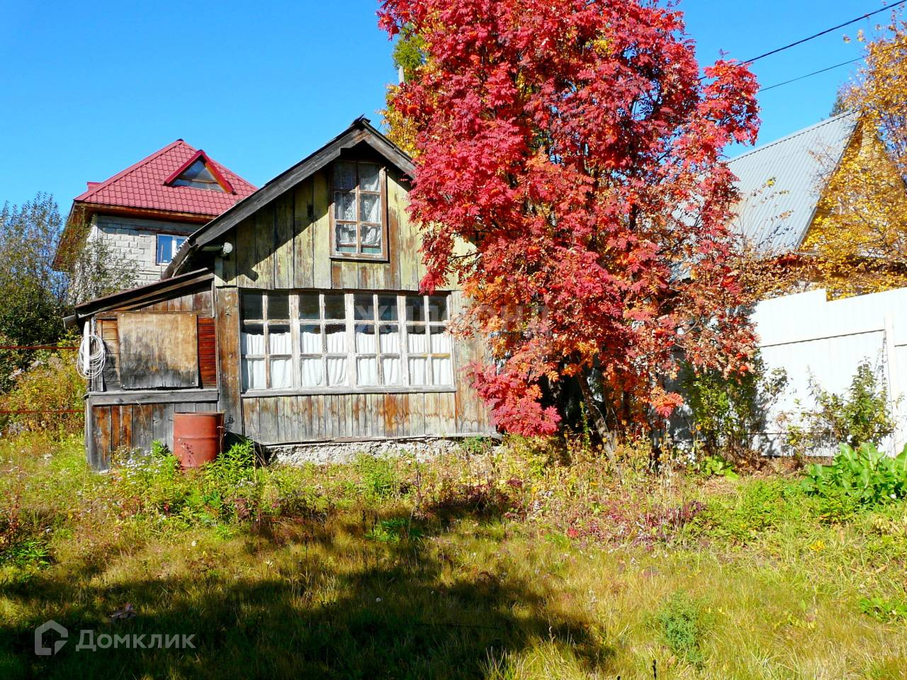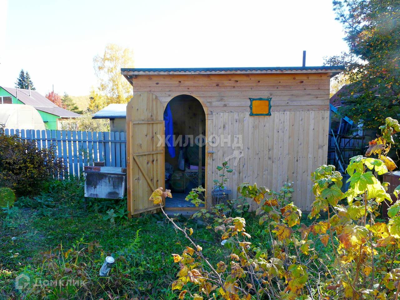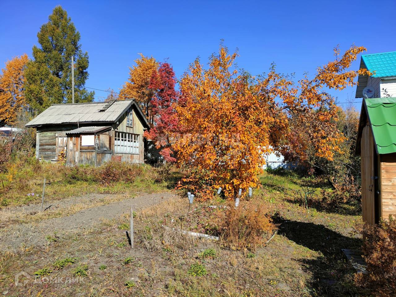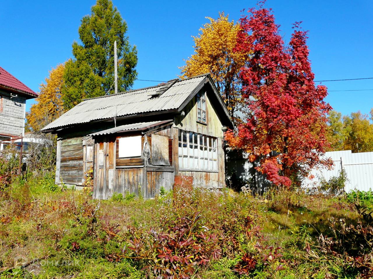На участке старый домик. Если перестелить пол и подремонтировать крышу, то временно можно жить. Новая бытовка 2021 года постройки (2х3 м, внутри кухонные шкафчики). Уличный туалет 2020 года постройки (практически не пользовались). Забор из профнастила 2016 года постройки, есть ворота для машины.