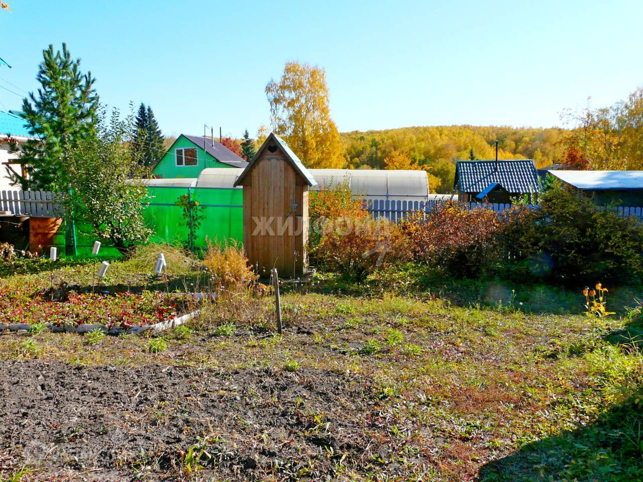 На участке две яблони полукультурки, стелящейся яблоня (плодоносит крупными яблоками), ранетка, кусты смородины, калины, рябины, ирга, красная смородина, облепиха, клубника, крыжовник, жимолость, вишня.