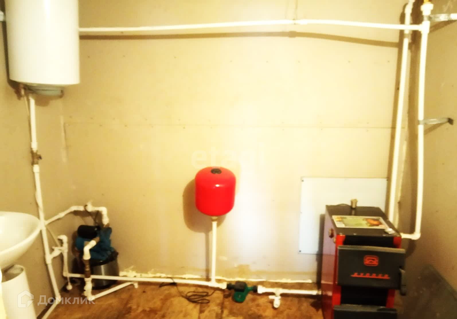 Вода центральная, канализация. Отопление - водяное, твердотопливный котел.