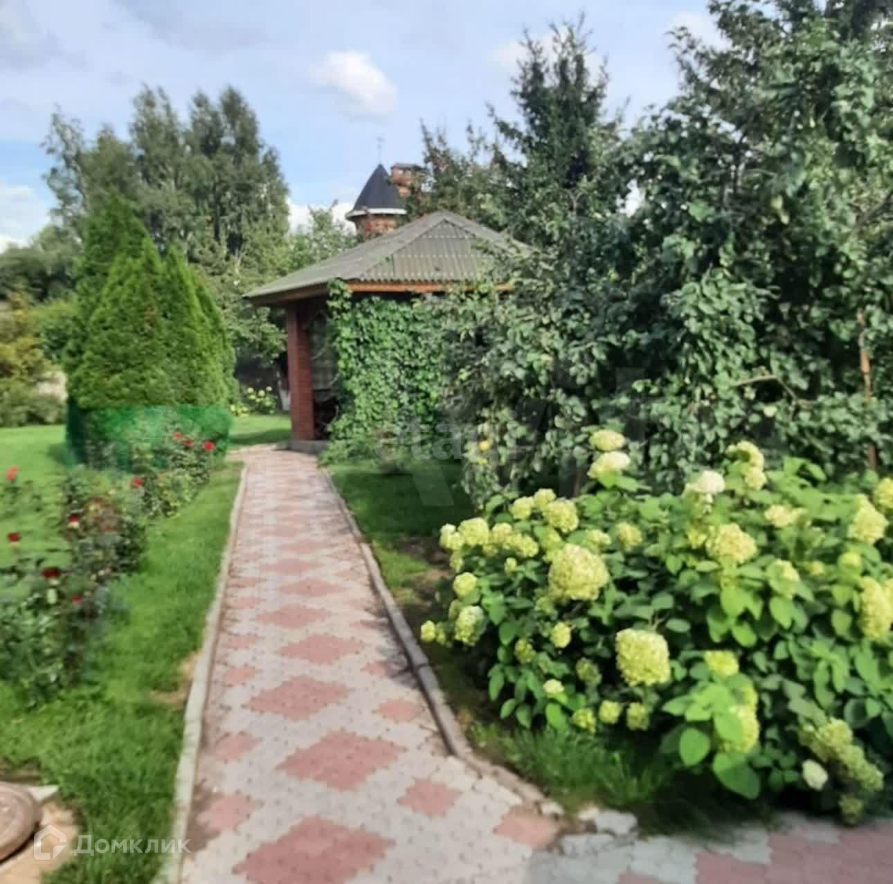Коттедж расположен на участке 15 соток, на котором построен гараж на две машины, а также беседка для отдыха. Участок очень зеленый, посажены цветы, яблони, вишня, газон. Выложена тротуарная плитка.