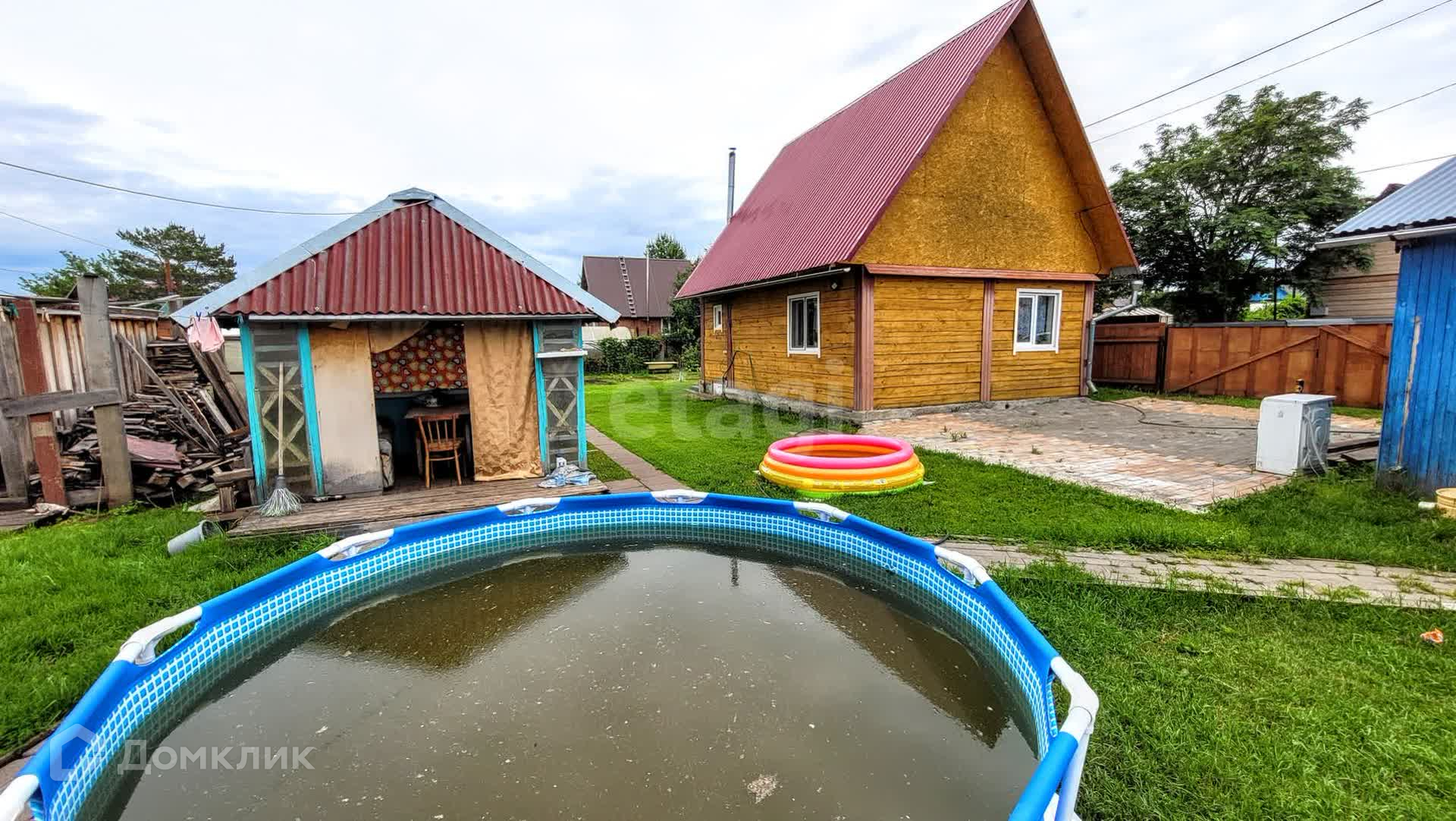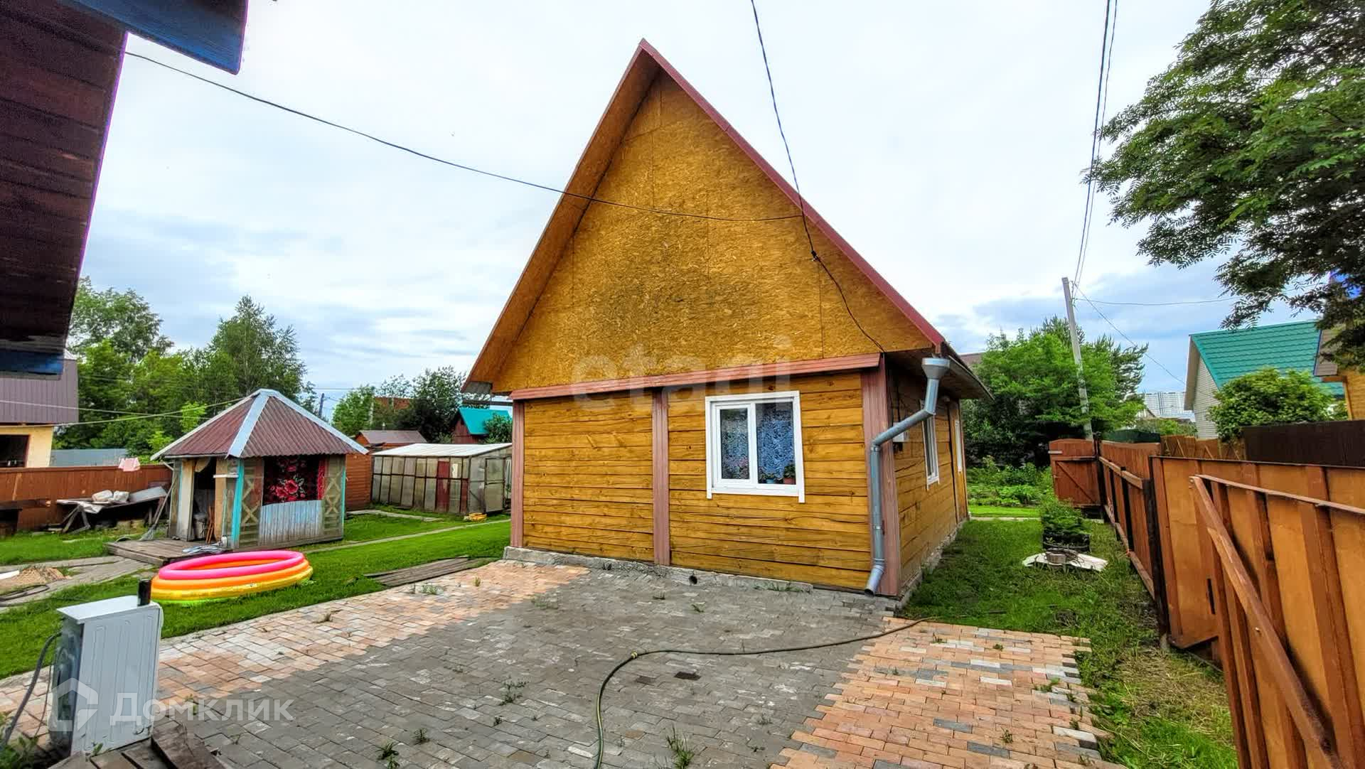 Кроме дома есть и беседка, и баня, и летняя кухня. Просторный участок двора покрыт плиткой 2-3 машины встанут без труда.