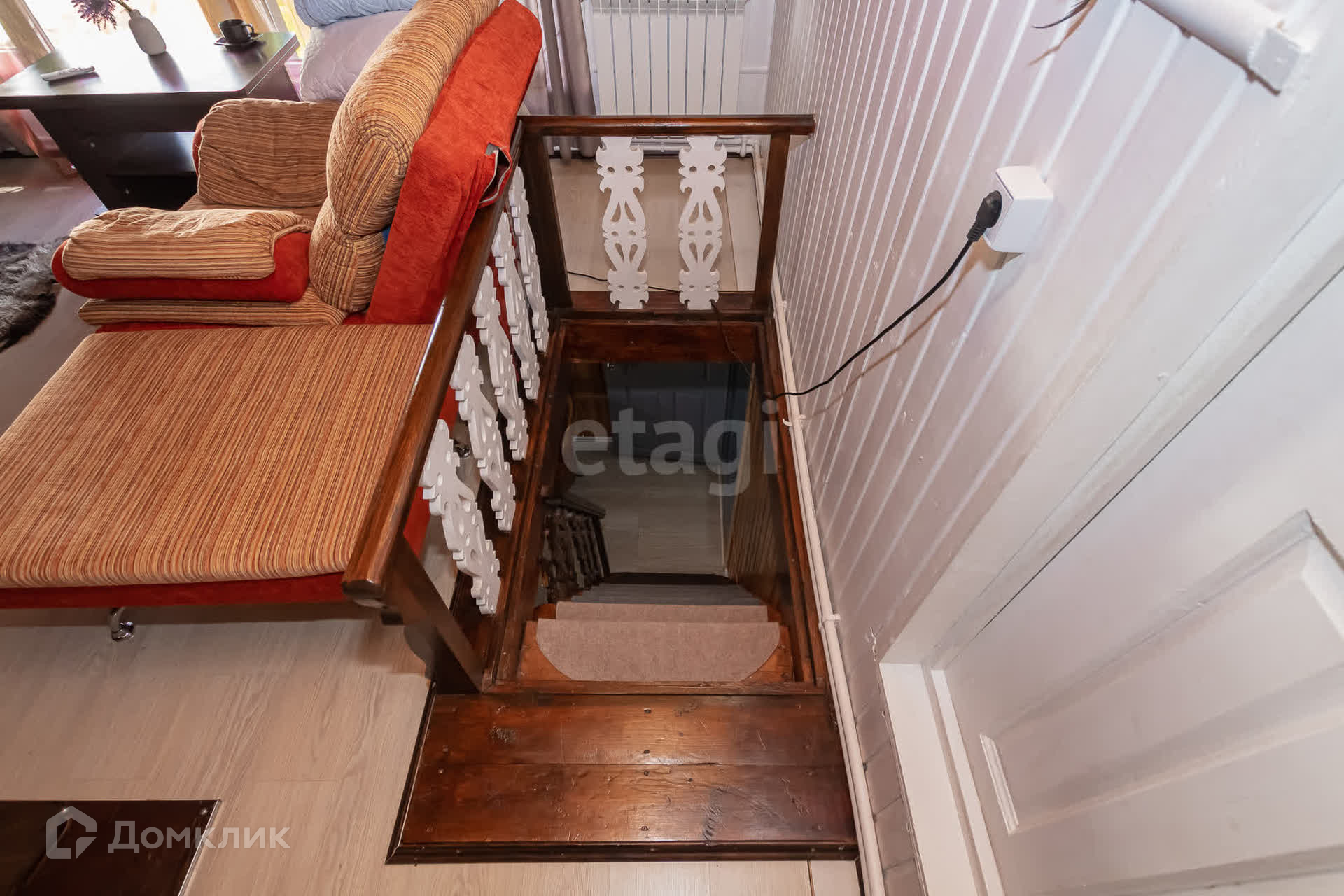 Двухэтажный дом, на первом этаже комната и кухня, на в тором этаже большая спальня.