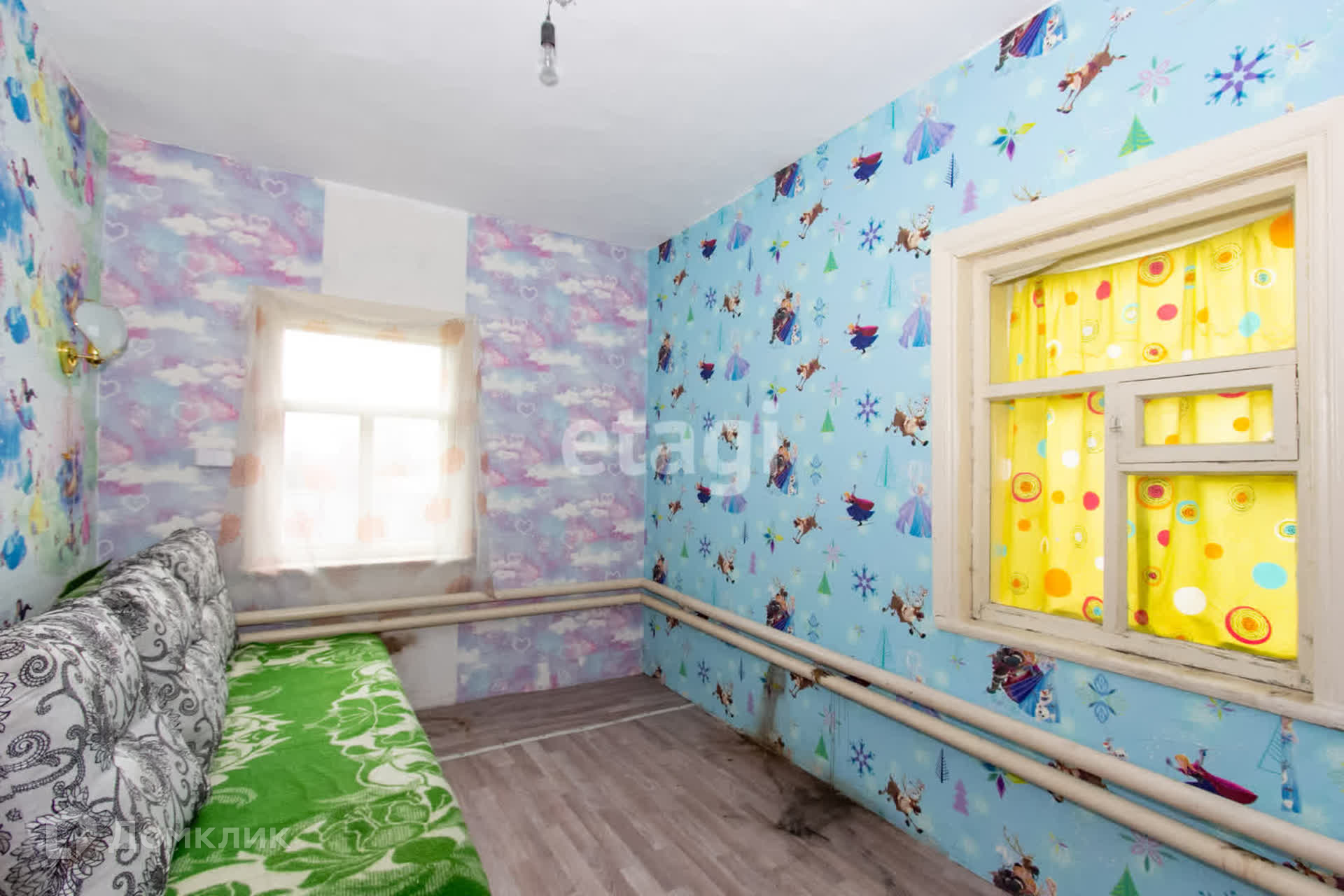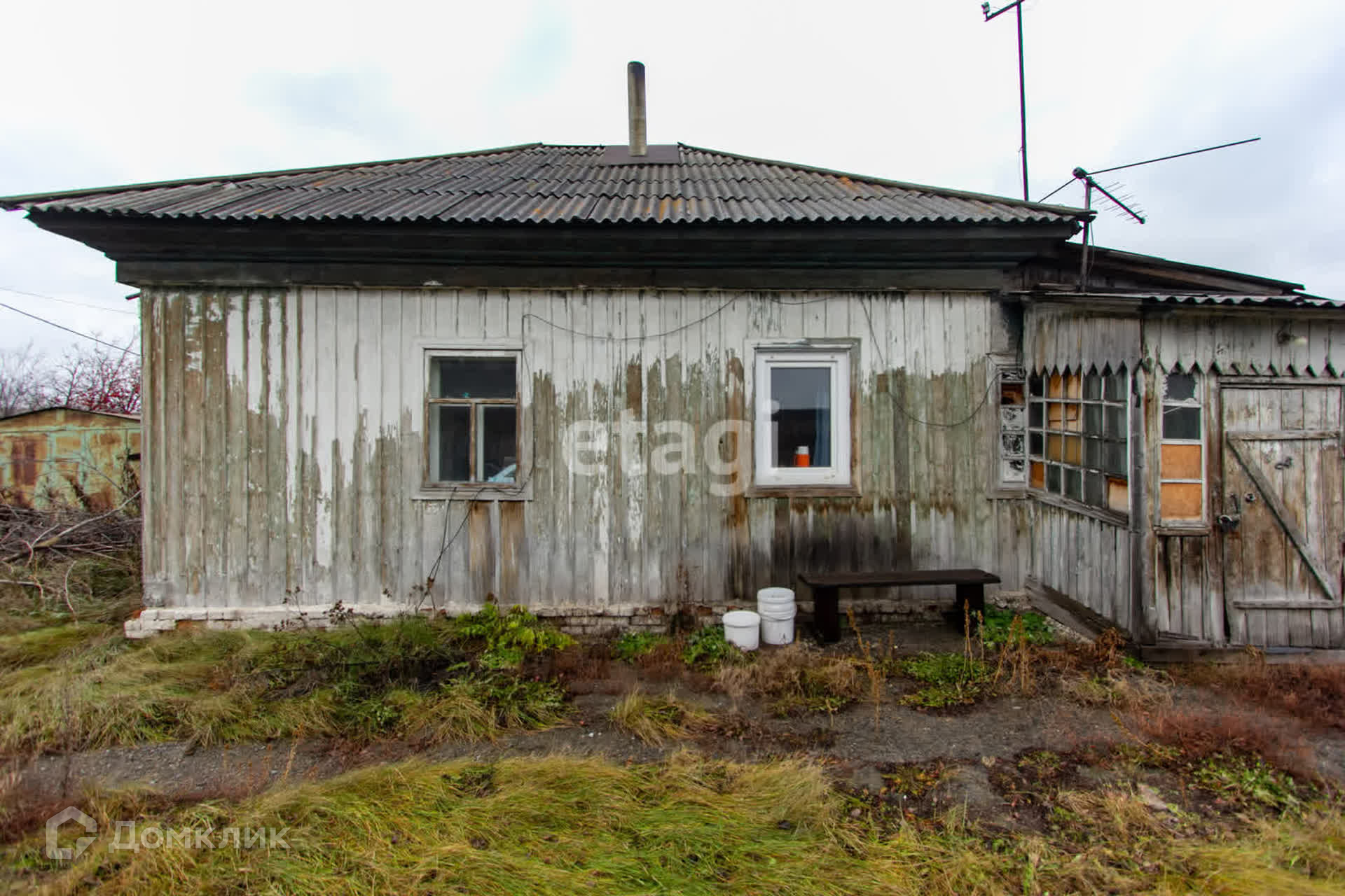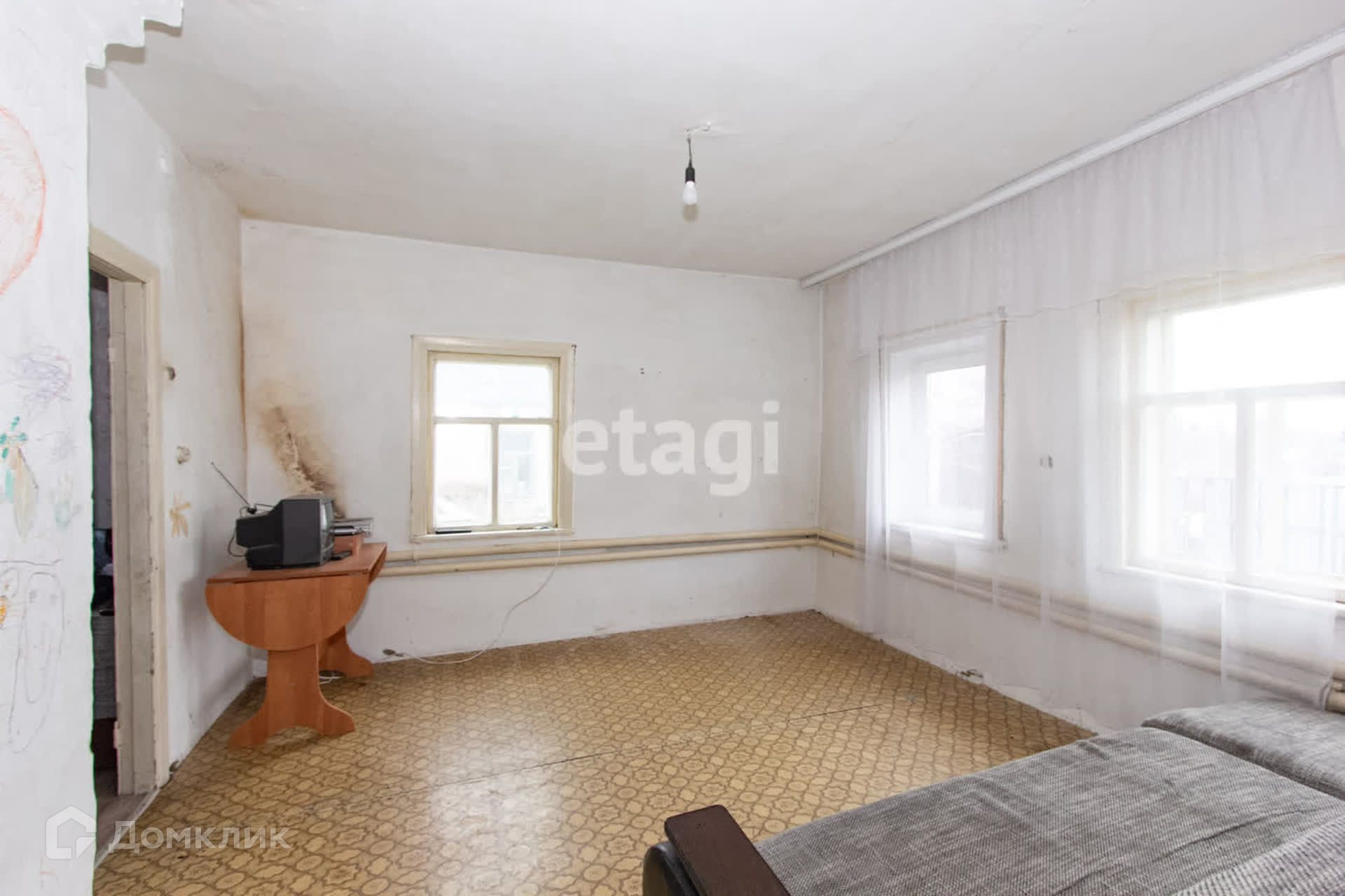 Дом построен по каркасной технологии со шлaкозacыпным наполнением на кирпичном фундаменте. Два окна заменены на пластиковые.