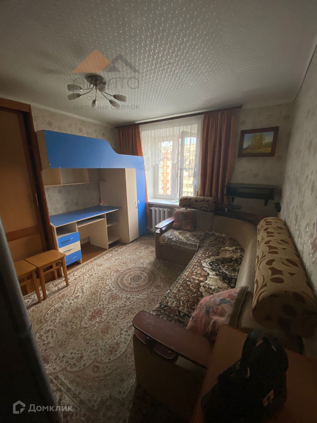 Комната с ремонтом в кирпичном доме. Стены выровнены, обои поклеены, на полу ковер, установлены пластиковые окна. Есть вся необходимая для комфортной жизни мебель и техника : стиральная машина, электрическая плитка, холодильник, шкафы, раздвижной диван, множество полок и шкафчиков. Вся мебель и техника остаётся после продажи.
