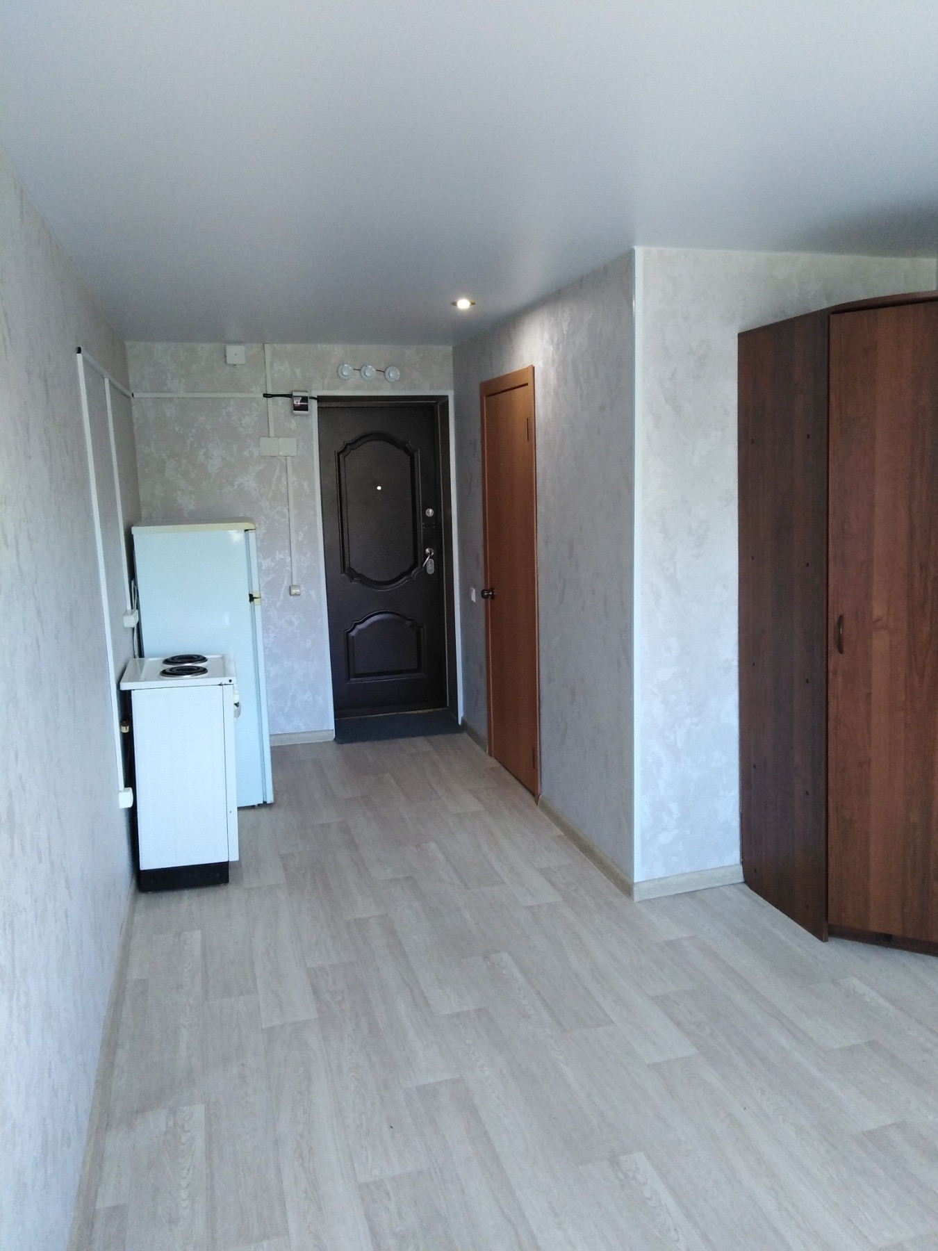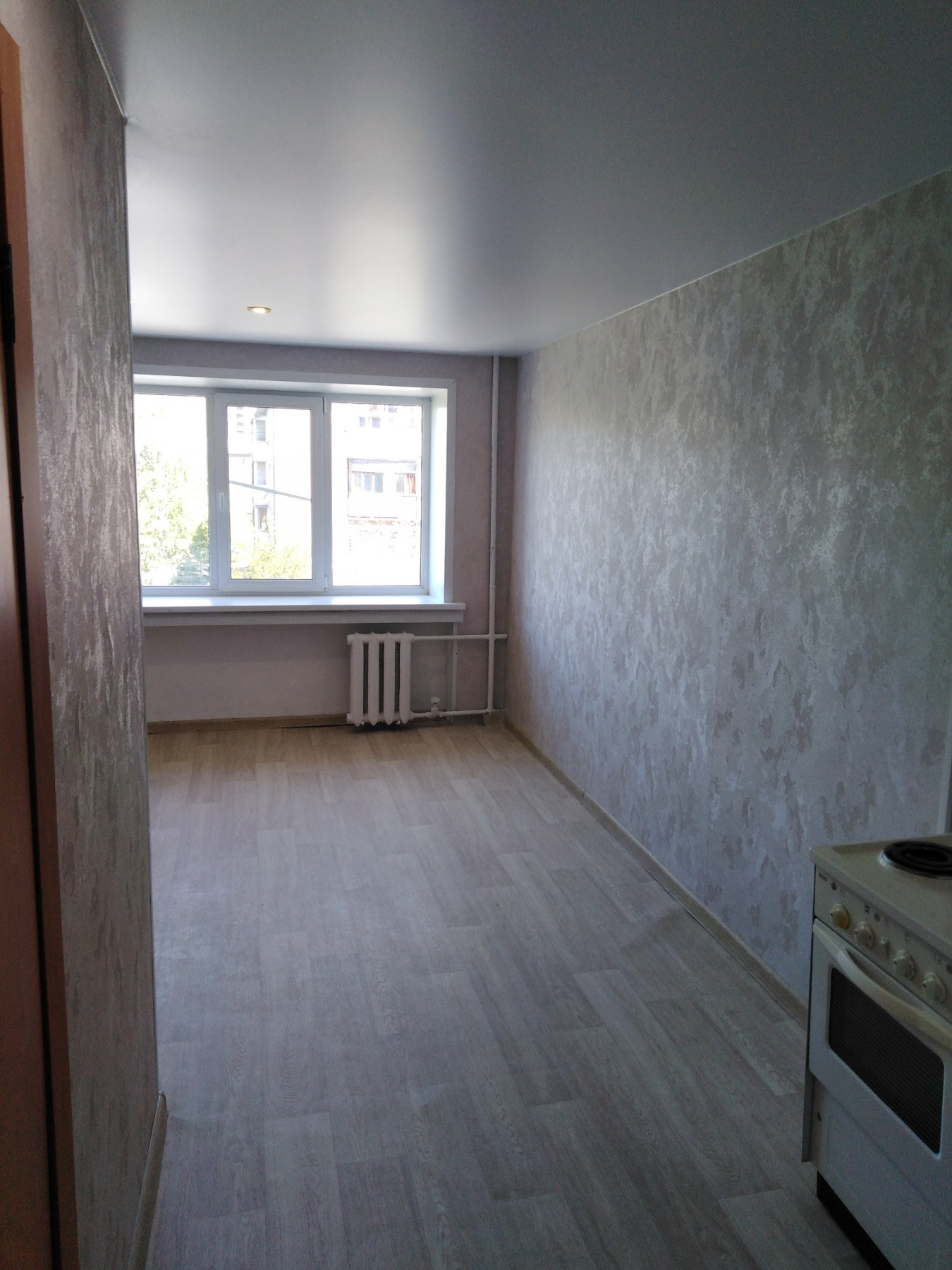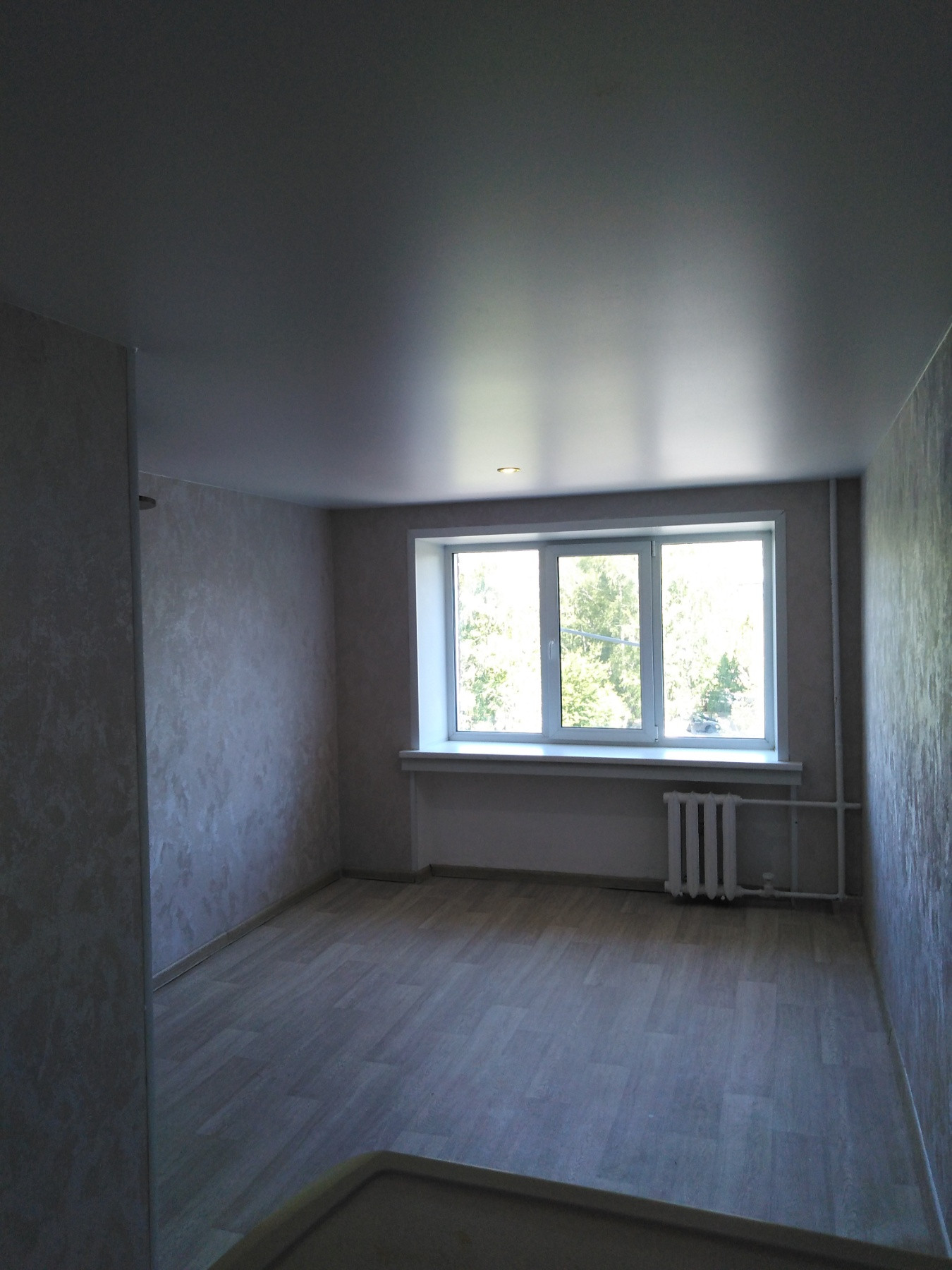 Комната-студия в общежитии, с индивидуальным санузлом (раковина, унитаз, душевая кабина), свежим ремонтом, новая электрическая проводка, централизованная пожарная сигнализация, пластиковые окна, вид из окна во двор.