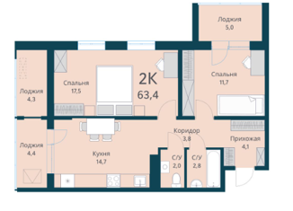 Общая площадь: 63.4 м2