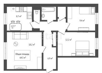 Общая площадь: 64.5 м2
