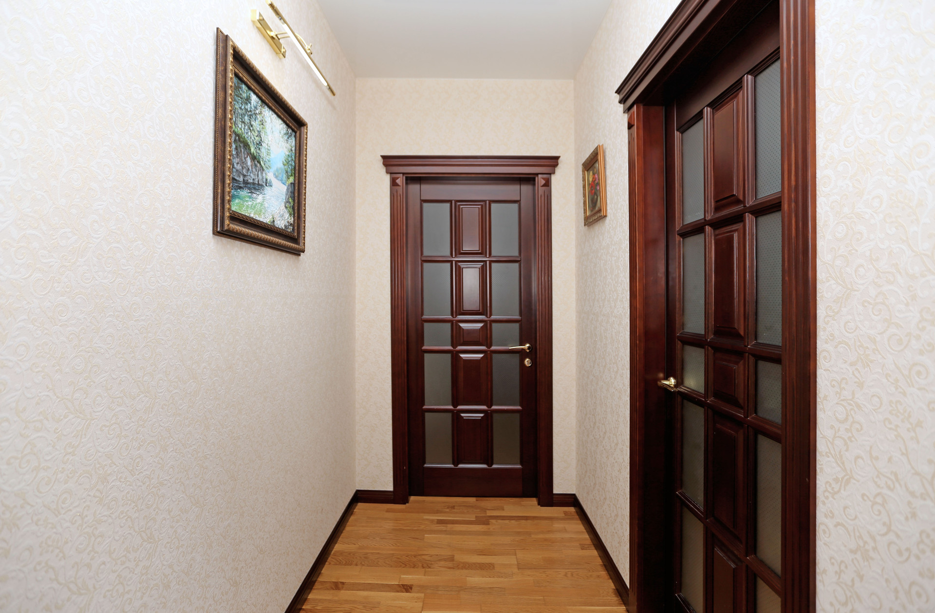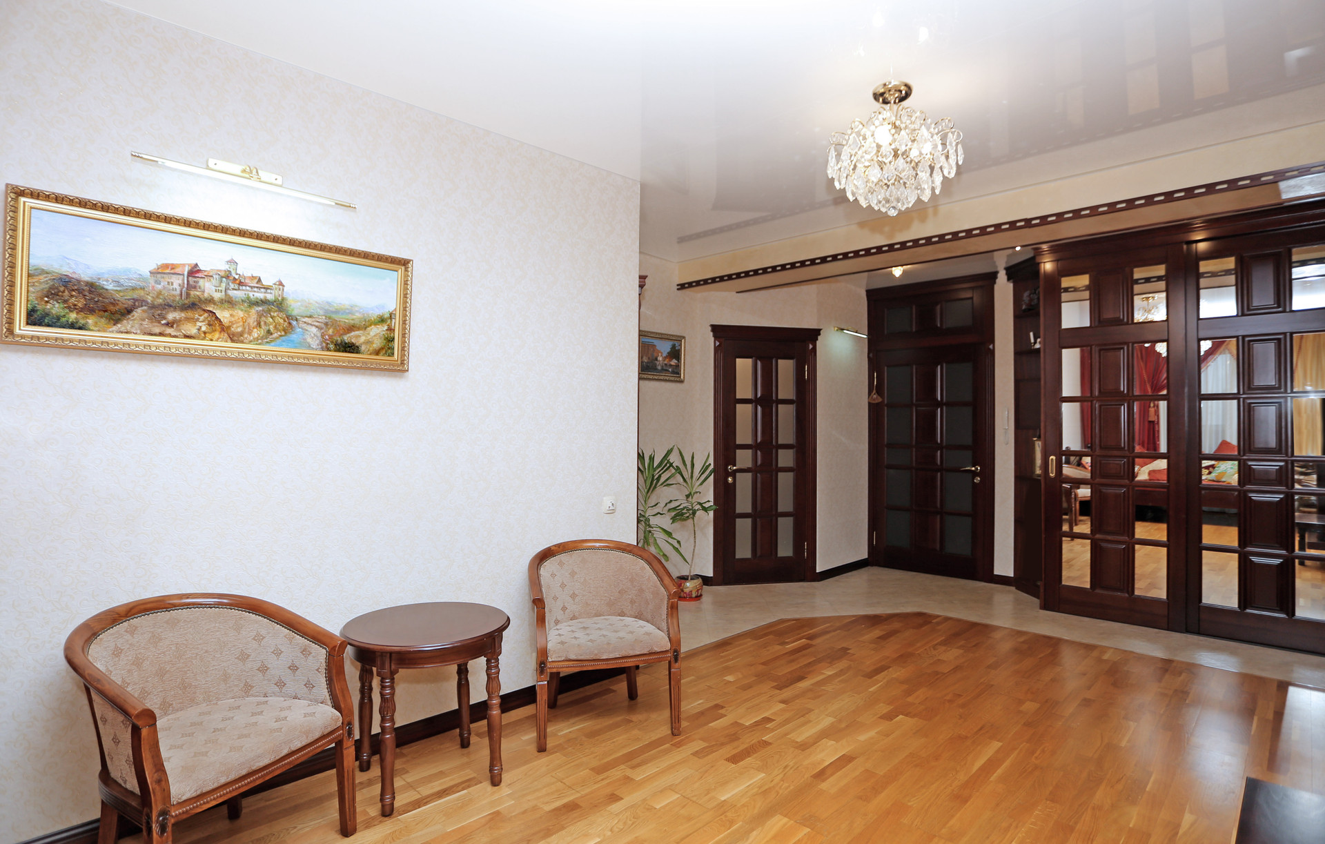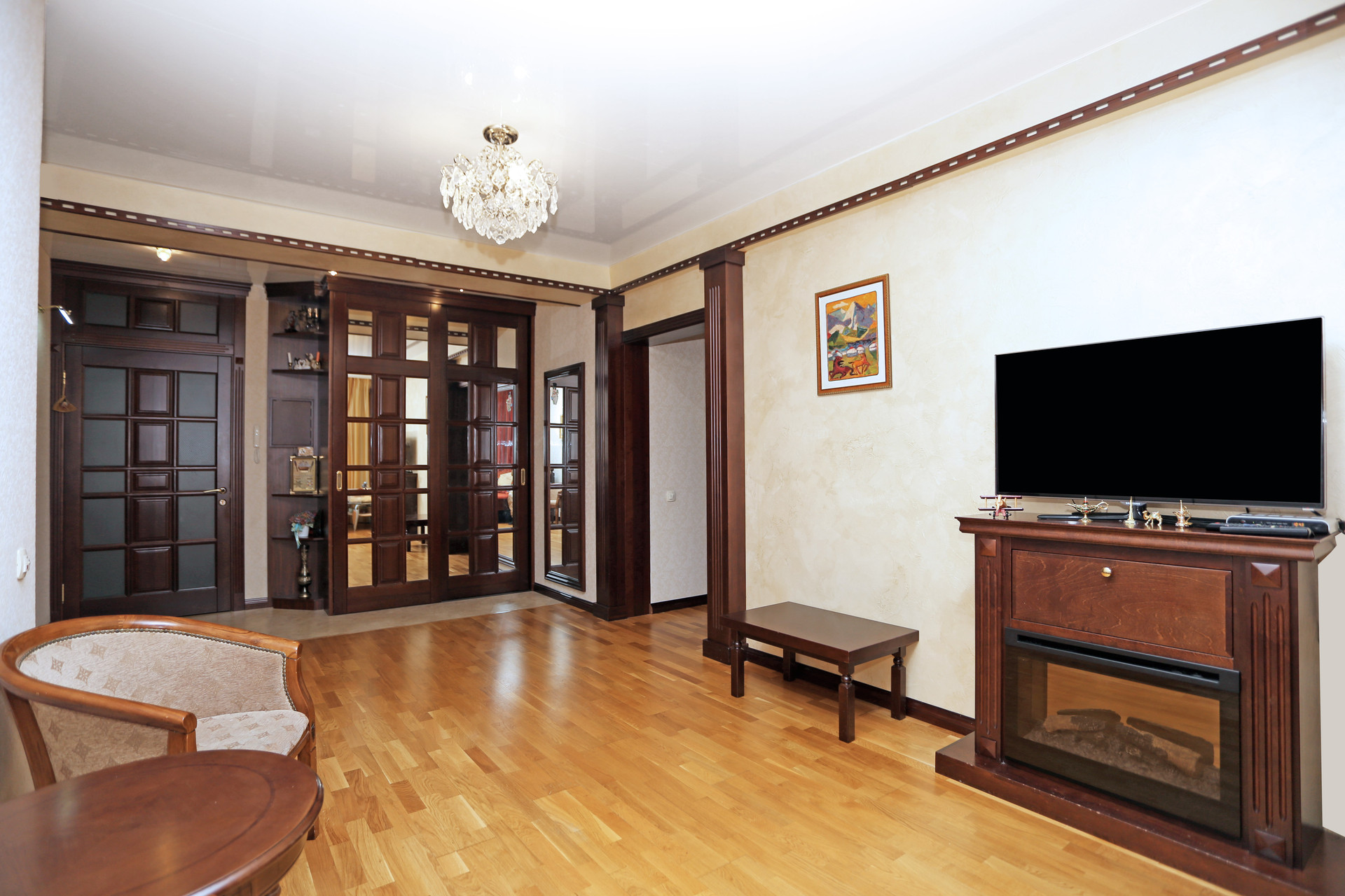 В отделке  использованы только качественные натуральные материалы- паркетная доска;  двери ,  мебель и элементы декора - из массива дерева.